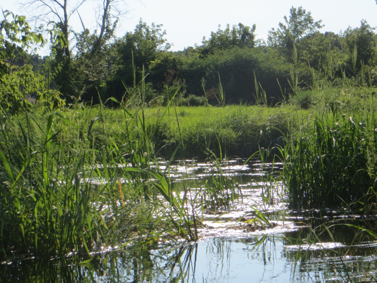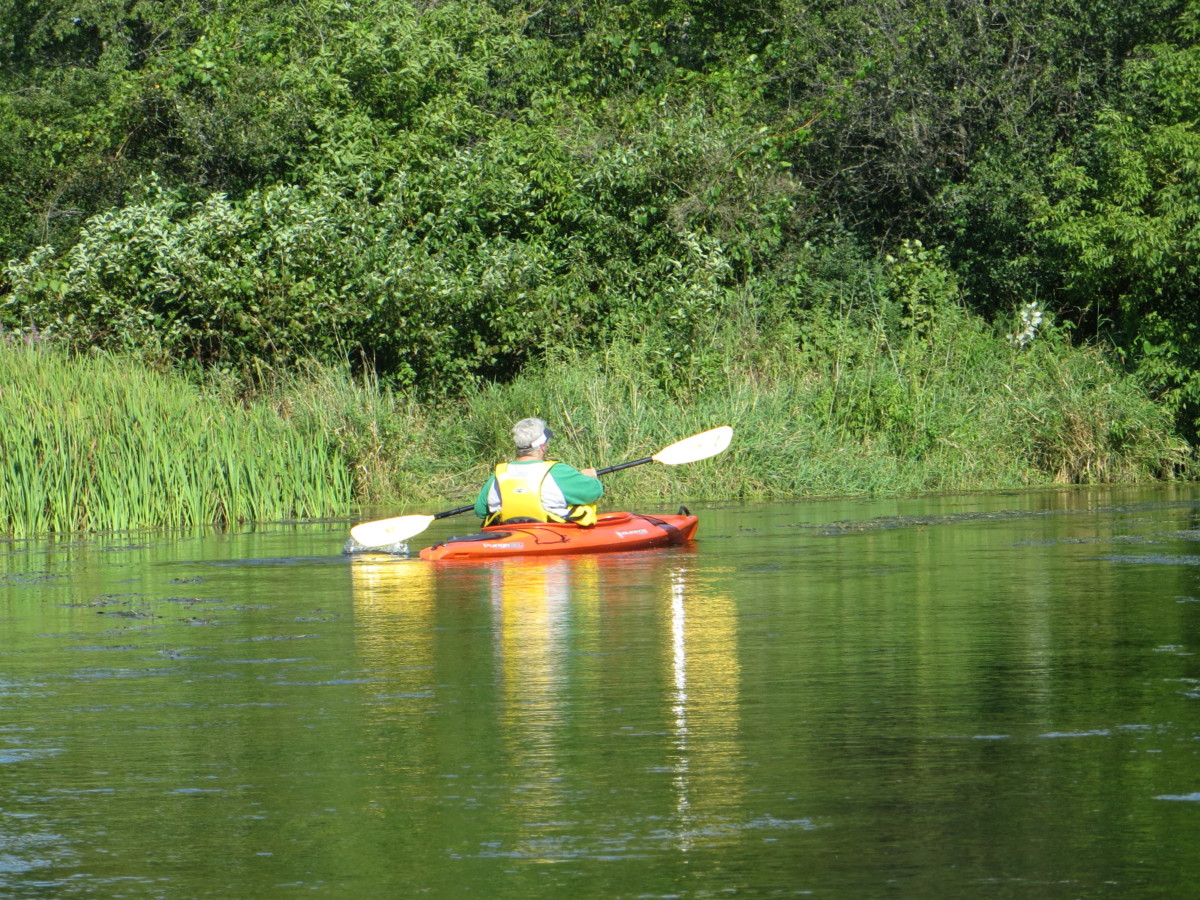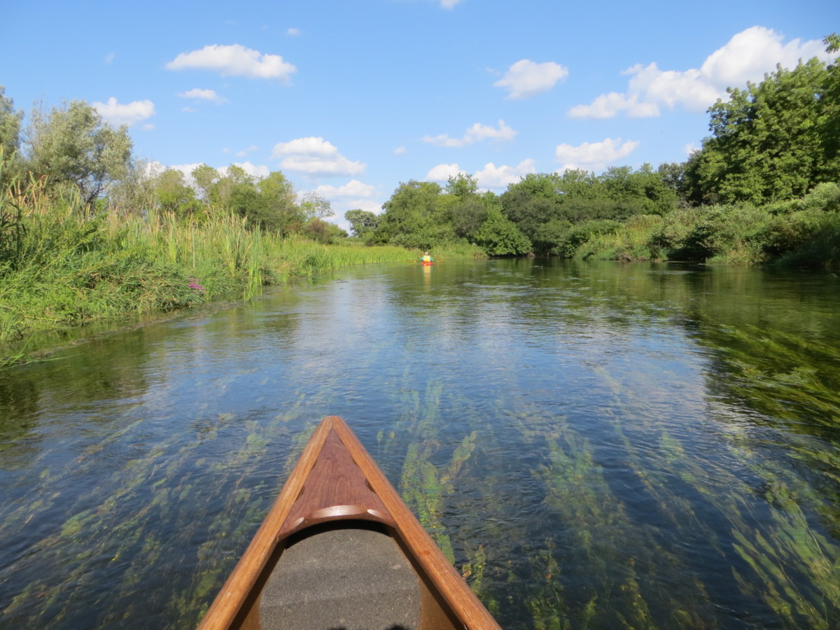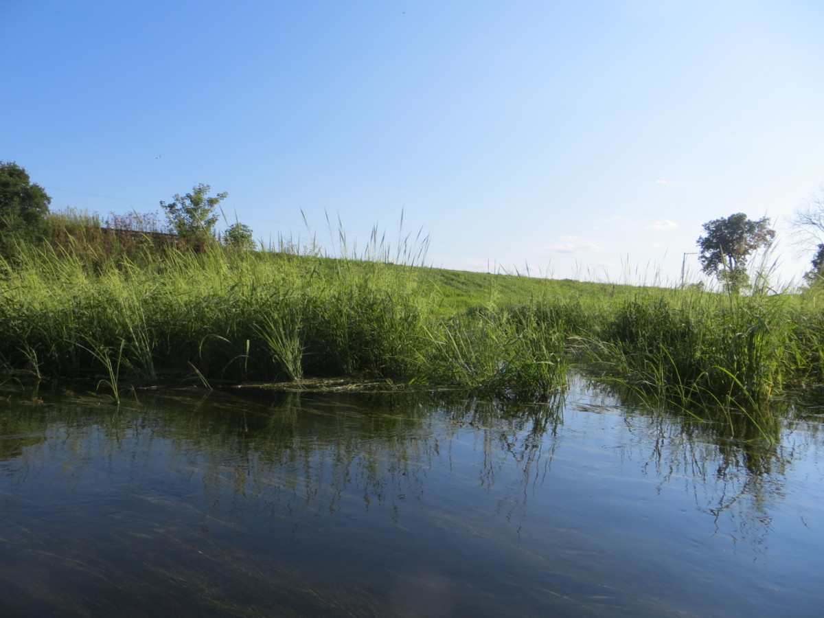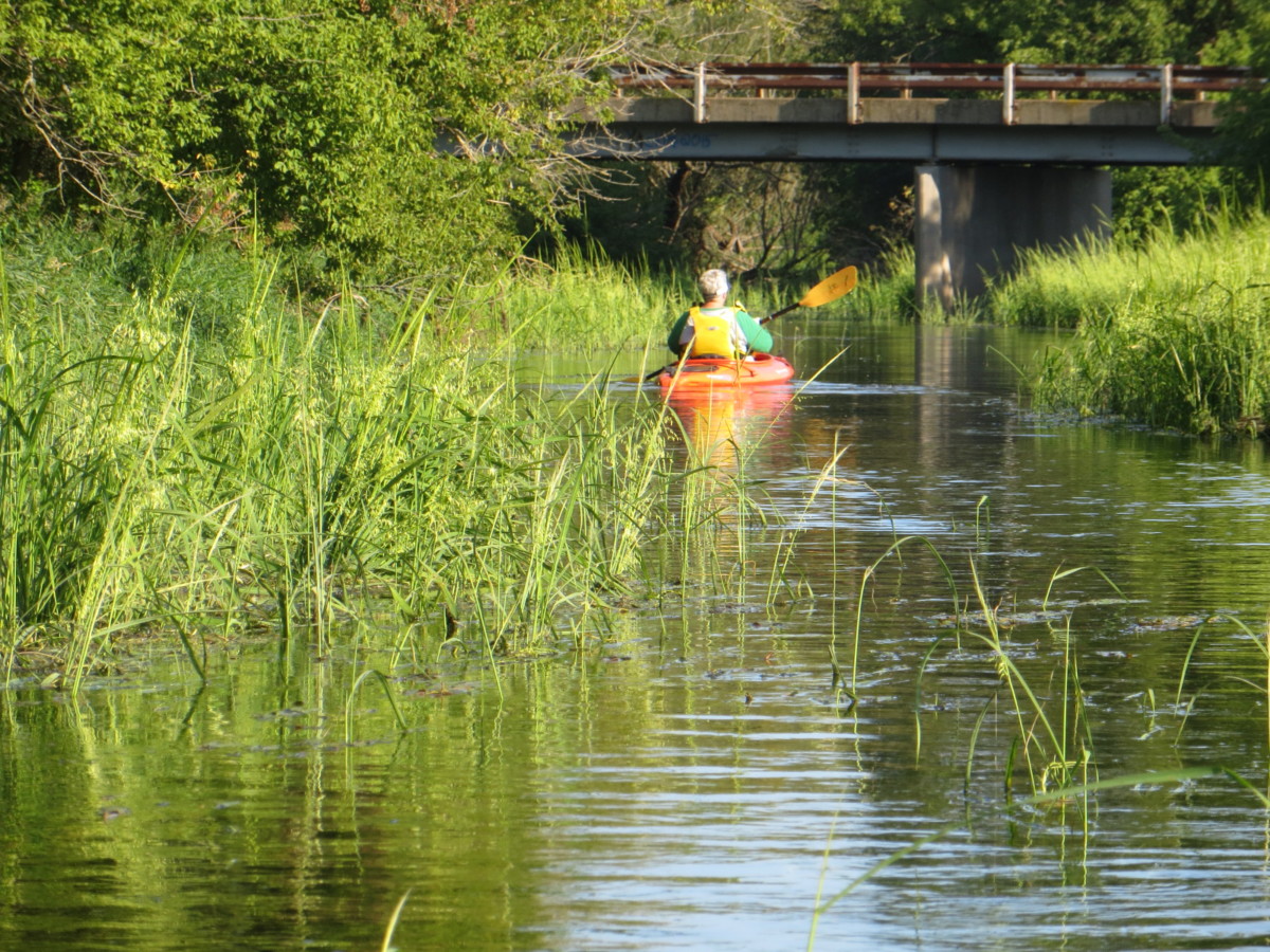 Setting: We wanted to try this creek after reading about it on milespaddled.com. We had scouted several landings a couple of weeks ahead of time and concluded that the Co Hwy C (Fairfield) put-in and the “pipeline” take-out (just off S. O’Riley Rd) would be best for us. We interrogated a group of casual paddlers as they passed under the E.Creek Rd bridge in canoes and kayaks. They seemed to be having a great time. They had put in at “Fairfield” and were going to take out at the “pipeline.” They said they had encountered no obstructions, floated easily over the weeds and had paddled this creek many times. Flow was about 70 cfs that day. We watched them navigate the deadfall below the bridge, and no one seemed to have any trouble. For our outing we chose a sunny Friday afternoon, temp around 80. P accompanied us in her kayak.