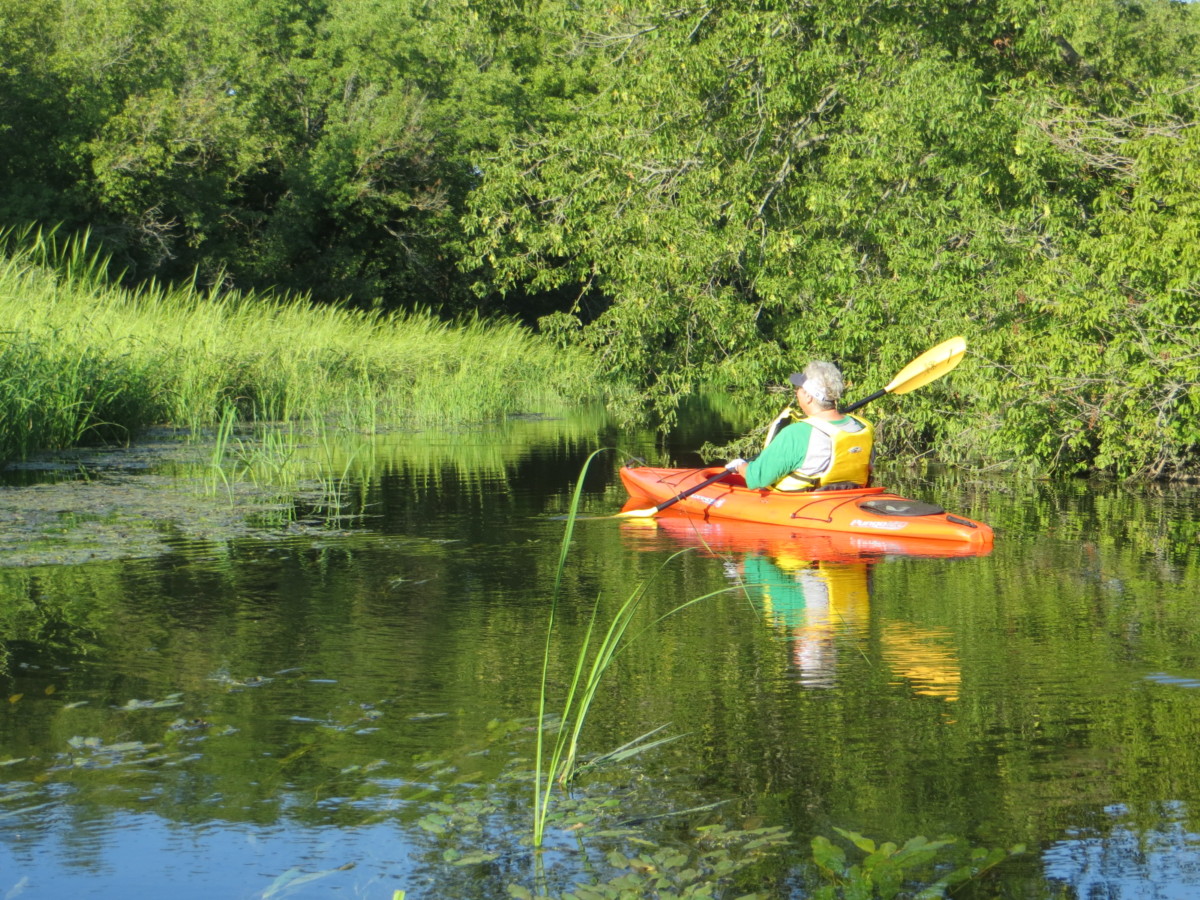 The paddle: Although the current looked fairly swift at the put in, we did not have any difficulty at the launch or during the paddle. Probably the current is too swift, however, to do this trip without a shuttle, even at low water levels. The water was clear but with long strands of vegetation under the surface which did not slow the boats. We did notice that P had to remove strings of vegetation from her paddle every few strokes during the first mile or two. There were intermittent stands of tall stalks of some type of grass. These could be easily avoided or paddled through. Depth seemed to vary from a few inches to 3-4 feet. No grounding. We had to maneuver around some tree debris just below the E.Creek Rd bridge, but with the slow current it wasn’t too scary. Otherwise, the creek was unobstructed by deadfall. The setting was isolated and pretty with nice reflections in the afternoon light. The creek was fairly twisty in places. Lots of shade but open sunny stretches as well. There were no houses. Probably the part we paddled was entirely within the Turtle Creek Wildlife Area. The trip was about 4.2 miles.