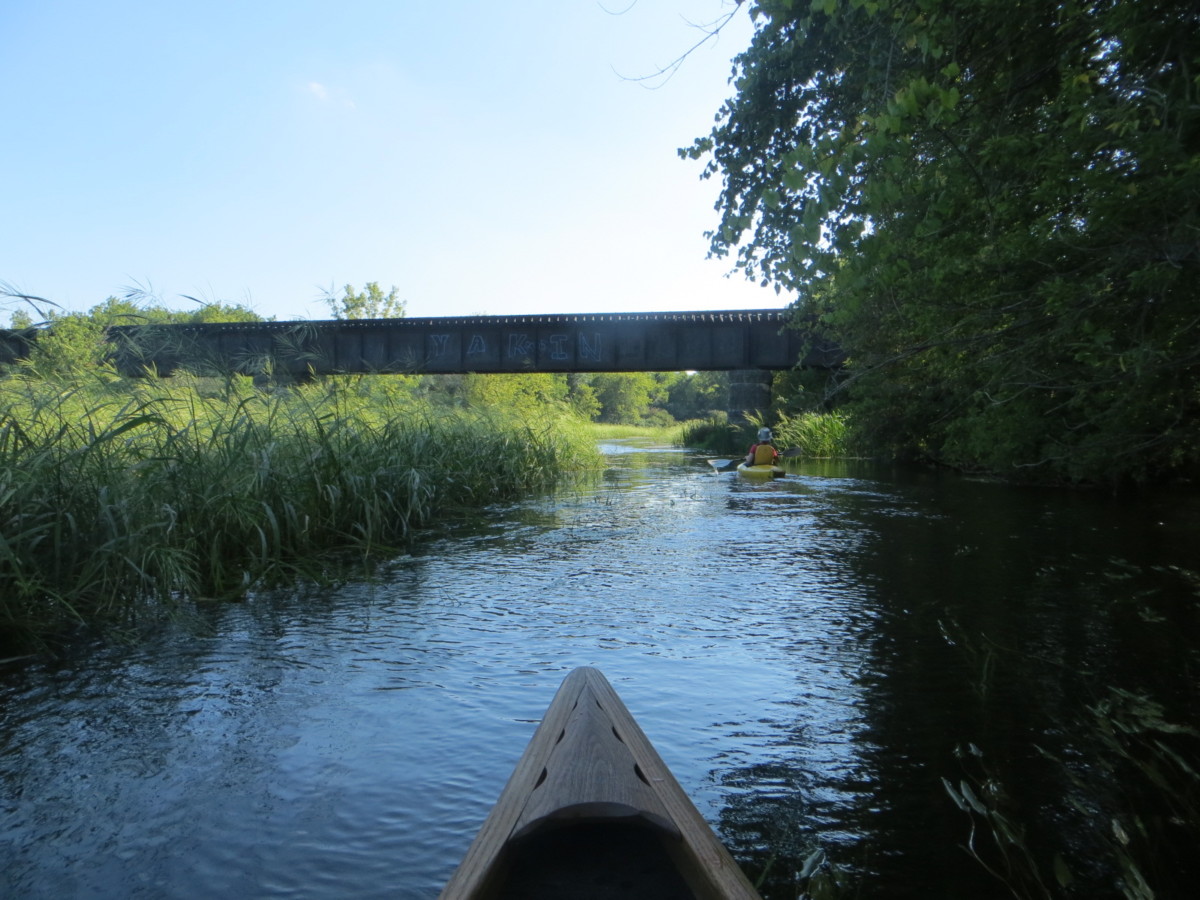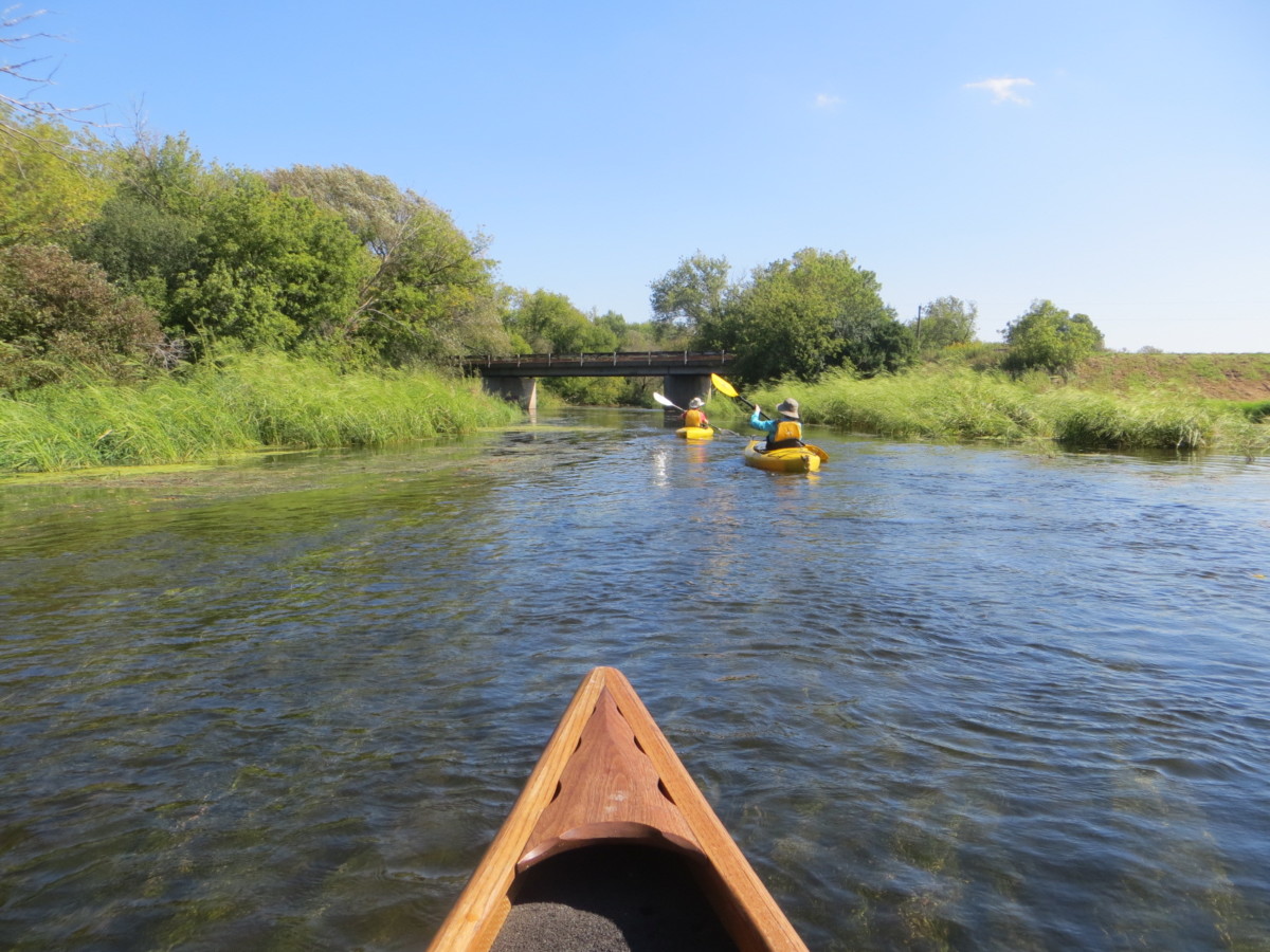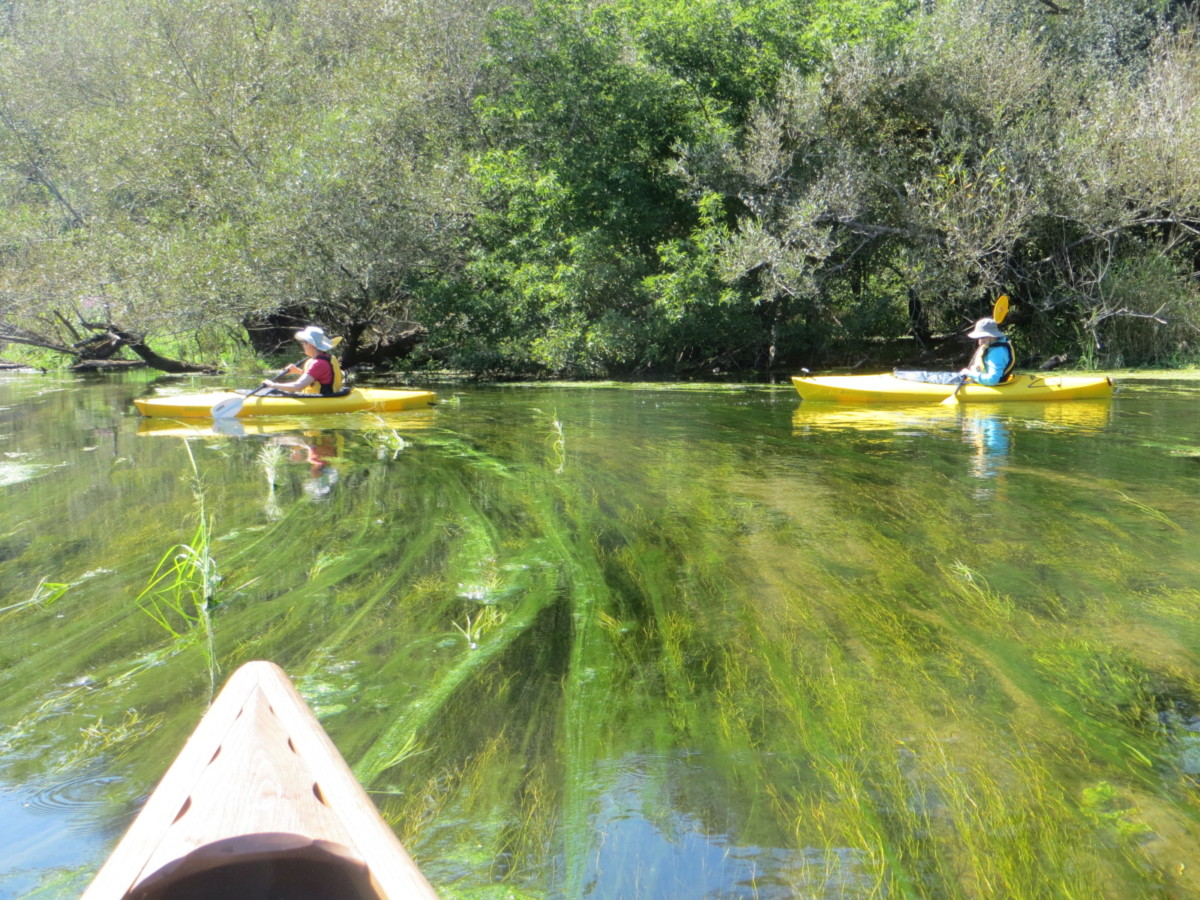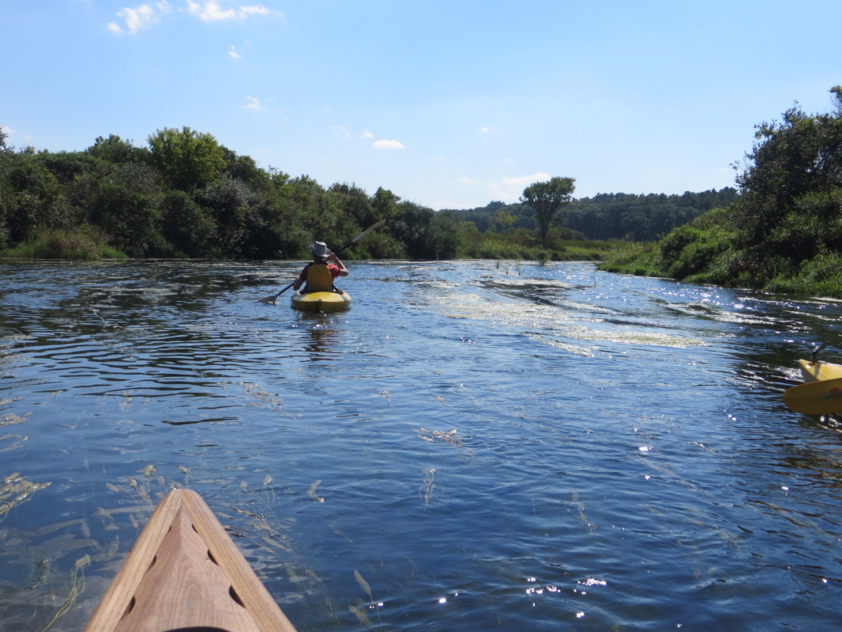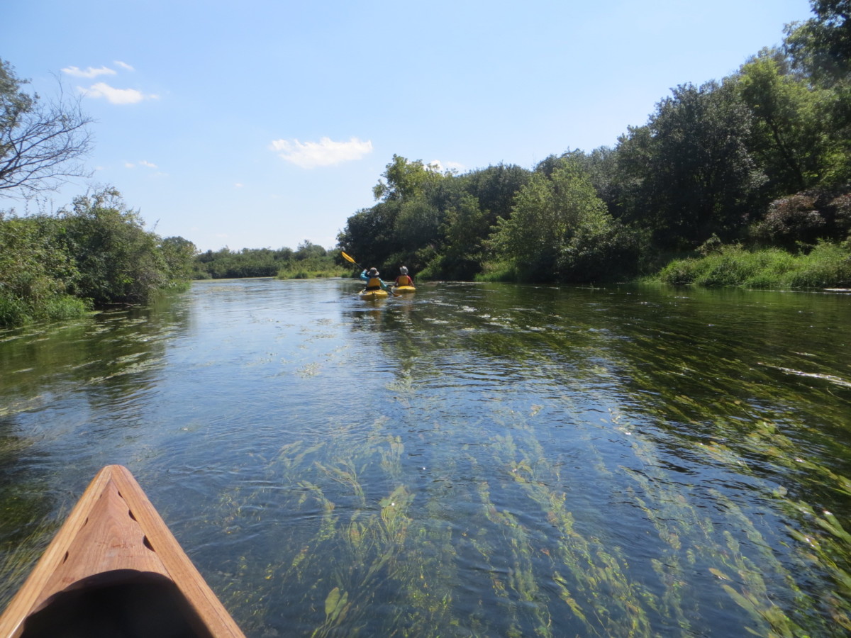 The put-in was grassy and a little slippery, but all of us launched without much trouble. The creek has a sandy bottom and a lot of underwater vegetation, most of which is probably native and has a right to be there. It wound around the kayak paddles occasionally but didn’t seem too bothersome to our kayaking companions. The duckweed is annoying but can be mostly avoided. We had to paddle through some tall grassy vegetation that we thought was wild rice on the last half of the trip, but it was always easy to find the main channel. The bridge on Creek Road is a little past the halfway point. There is a parking lot, and one could put in or take out there, although we never have. The creek feels quite remote-there are no houses at all and very little road noise. We didn’t see much wildlife except for a couple of turtles, red winged blackbirds, fish of various sizes, and a heron in flight at the takeout. The creek is unobstucted for the most part. There is occasional deadfall on the first part of the trip and just after the Creek Rd bridge but nothing that couldn’t be easily paddled around.