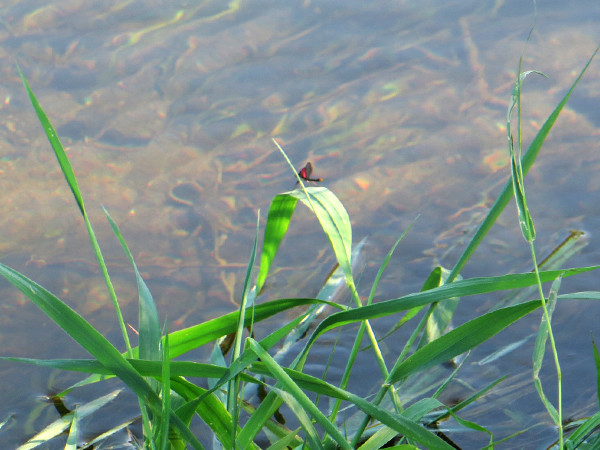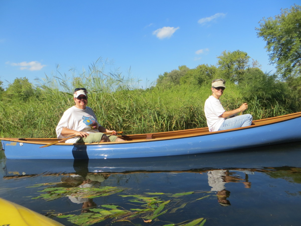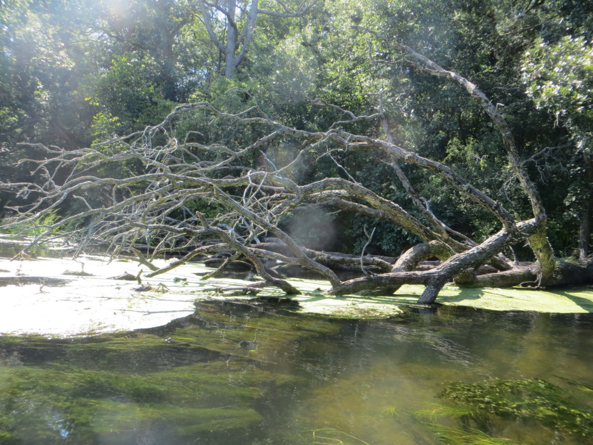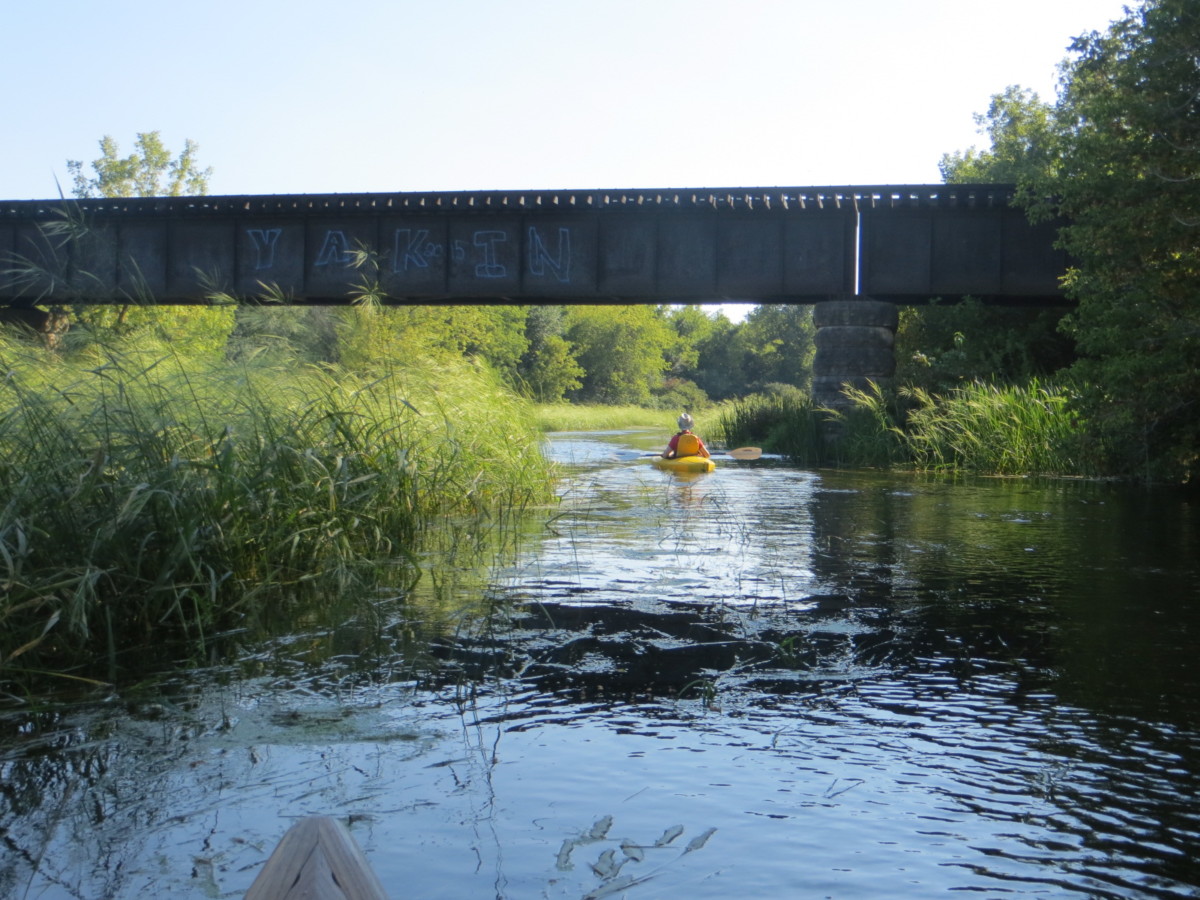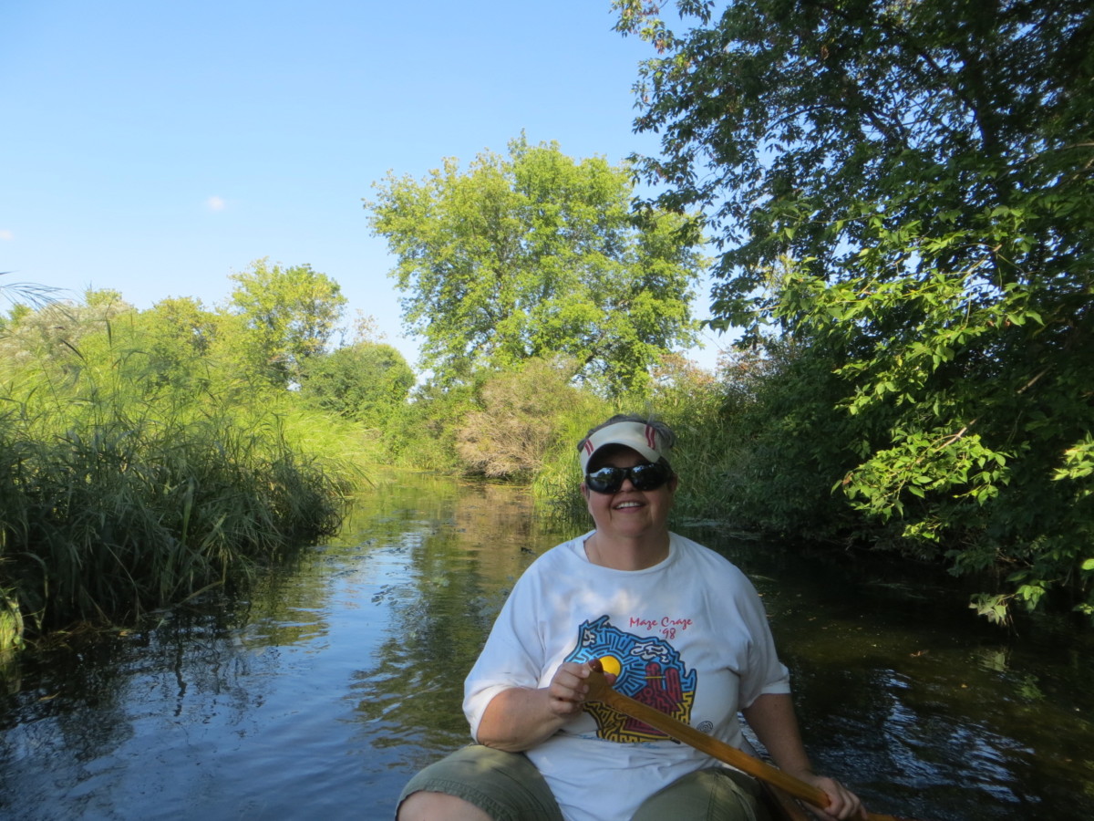 The put-in was grassy and a little slippery, but all of us launched without much trouble. The creek has a sandy bottom and a lot of underwater vegetation, most of which is probably native and has a right to be there. It wound around the kayak paddles occasionally but didn’t seem too bothersome to our kayaking companions. The duckweed is annoying but can be mostly avoided. We had to paddle through some tall grassy vegetation that we thought was wild rice on the last half of the trip, but it was always easy to find the main channel. The bridge on Creek Road is a little past the halfway point. There is a parking lot, and one could put in or take out there, although we never have. The creek feels quite remote-there are no houses at all and very little road noise. We didn’t see much wildlife except for a couple of turtles, red winged blackbirds, fish of various sizes, and a heron in flight at the takeout. The creek is unobstucted for the most part. There is occasional deadfall on the first part of the trip and just after the Creek Rd bridge but nothing that couldn’t be easily paddled around.