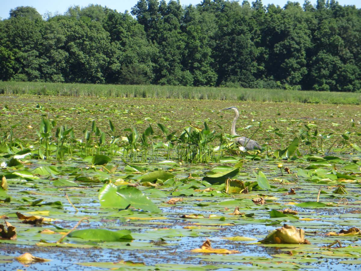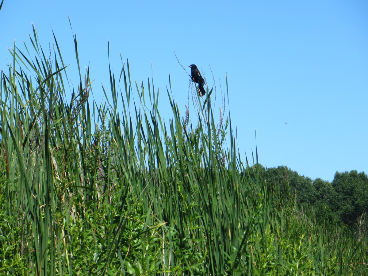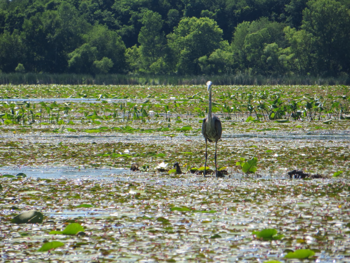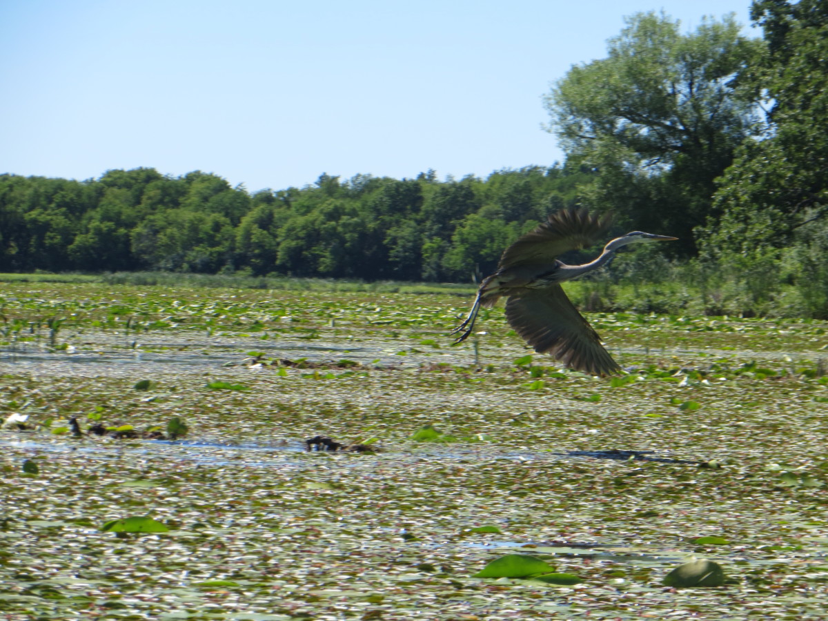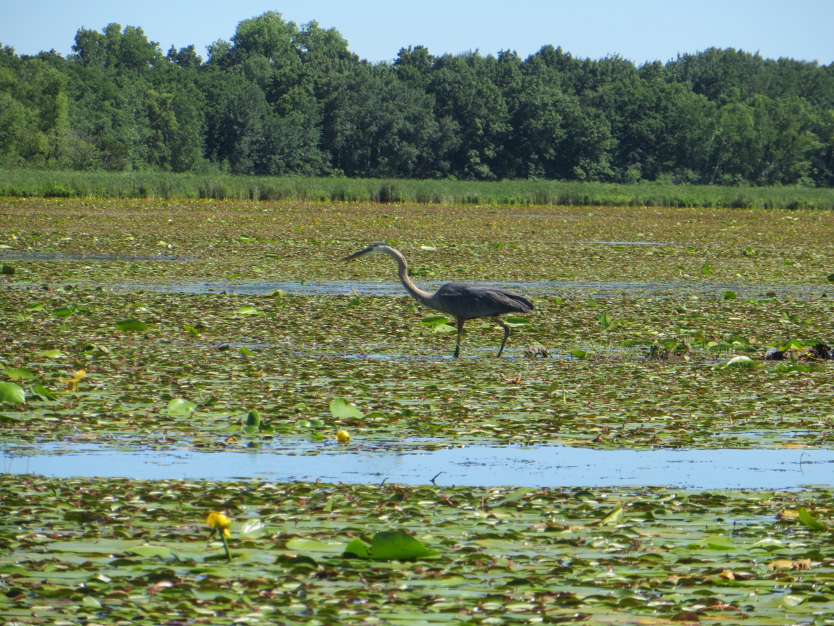 Frogs galore, great blue heron, red wing blackbird, saw yellow-headed blackbird which we see less frequently on WI waterways.