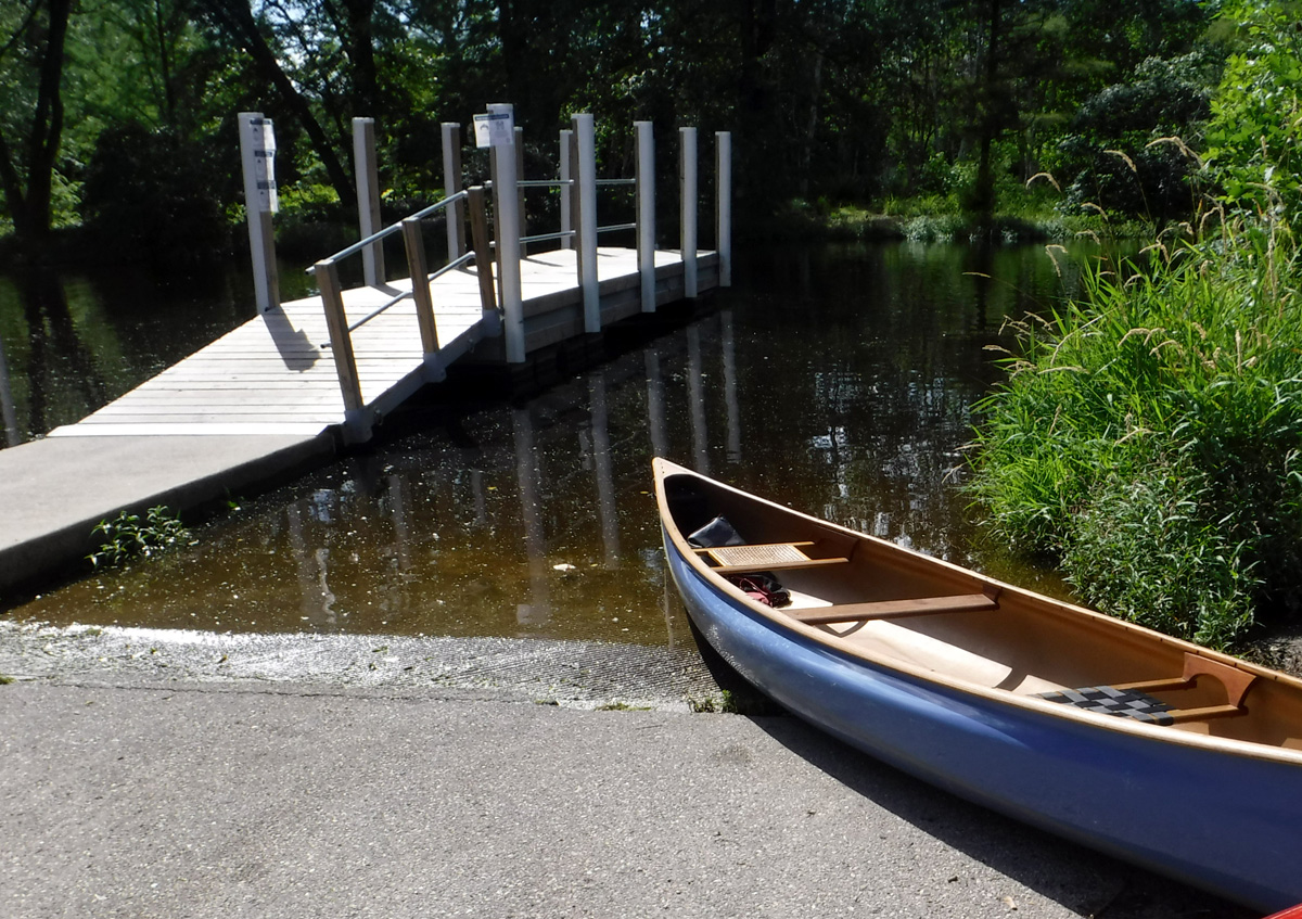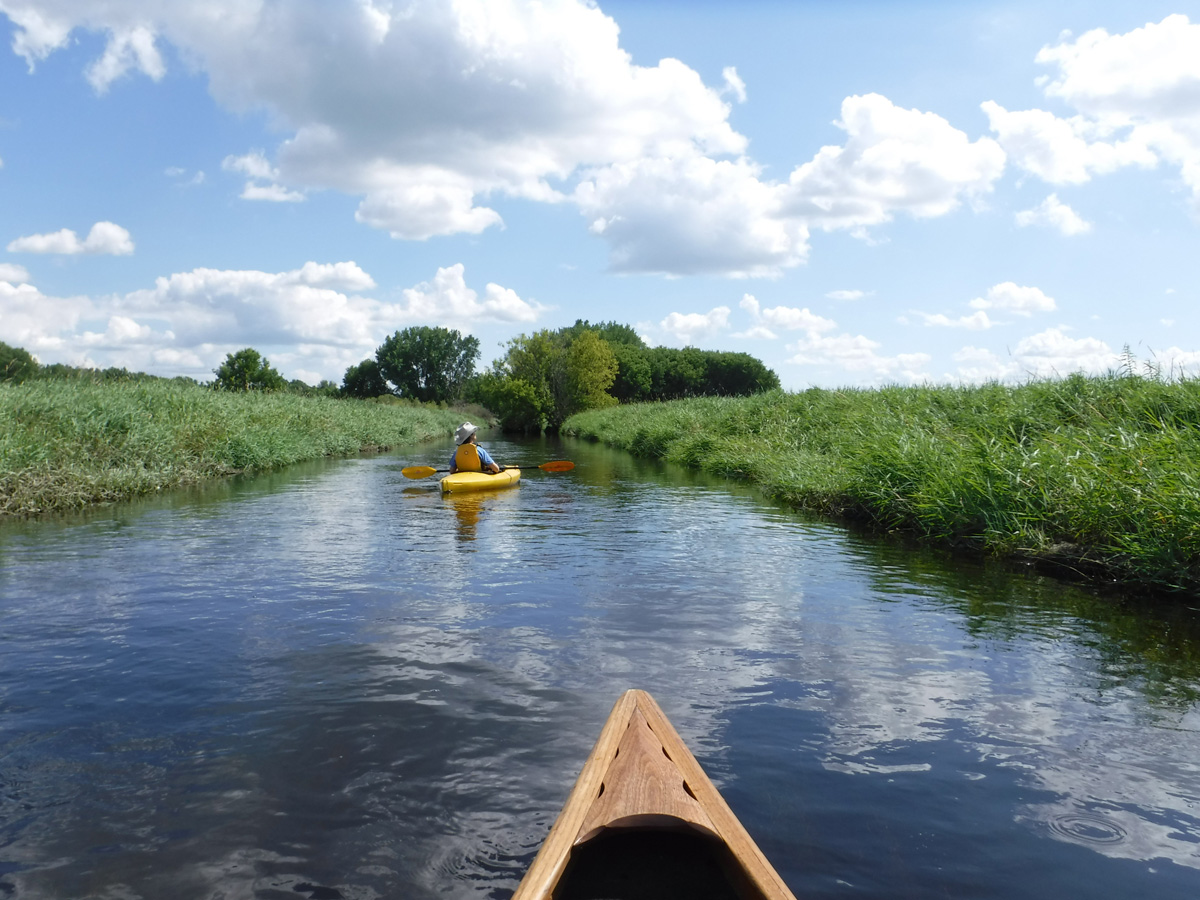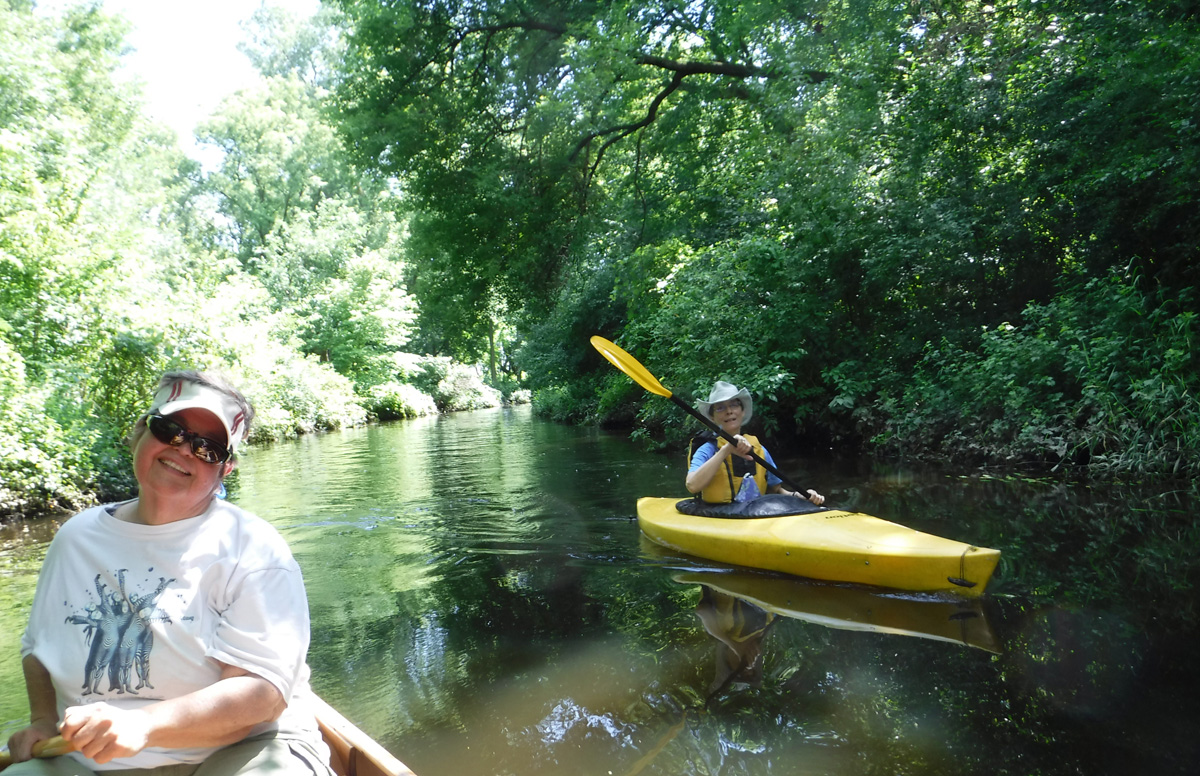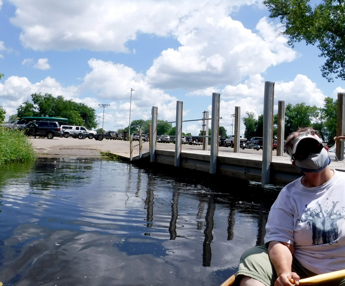 Wildlife: This is where we usually see dozens of turtles, but perhaps the high water was covering up their rock and log hangouts because we only saw two. We heard, but didn’t see, lots of frogs. Also, there were hundreds of dragonflies and the usual red-winged blackbirds and mallards and a muskrat. We saw one bird we could not identify – small tufted brownish bird with a yellow breast.