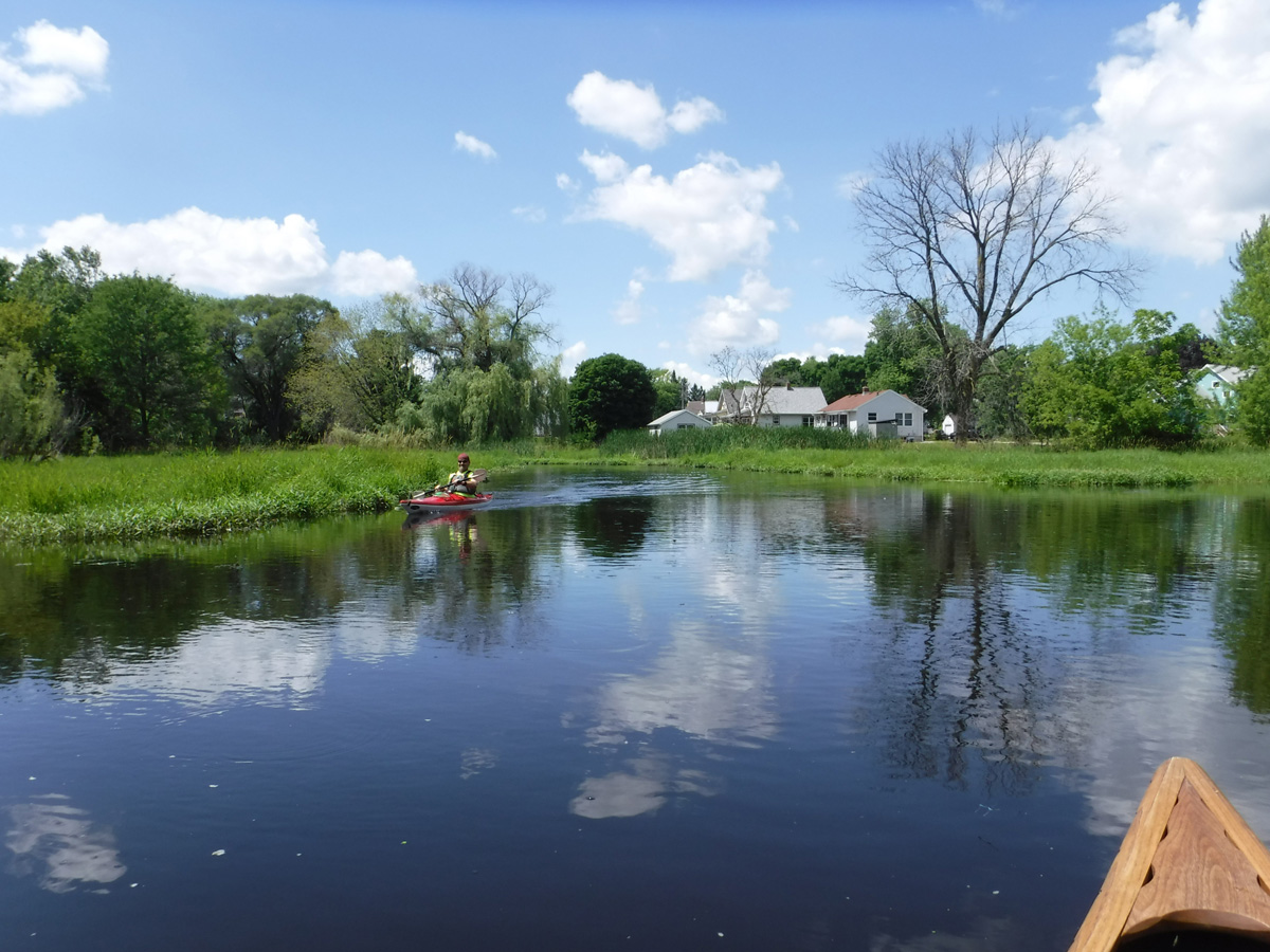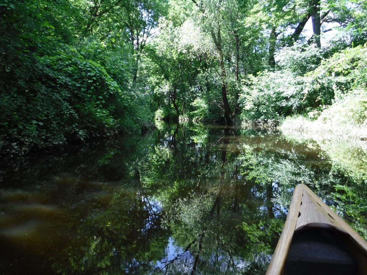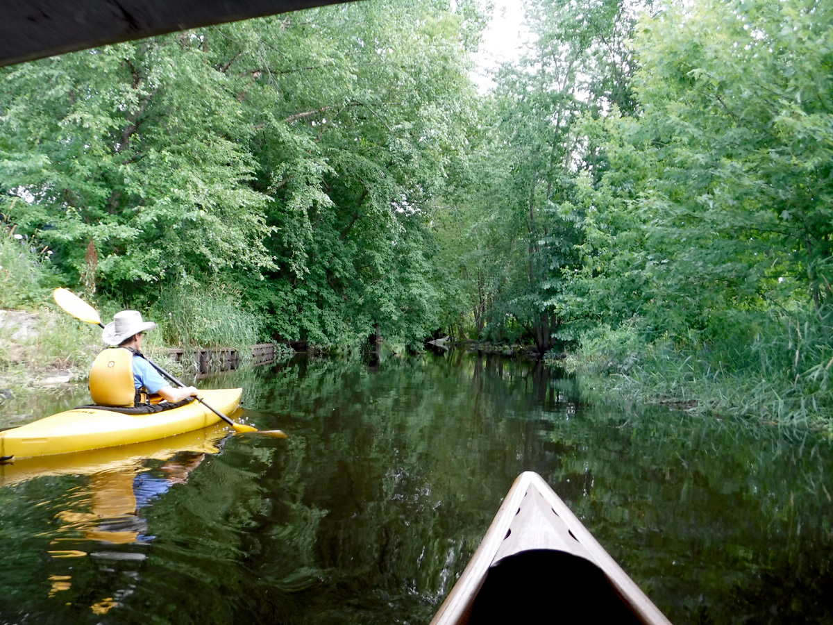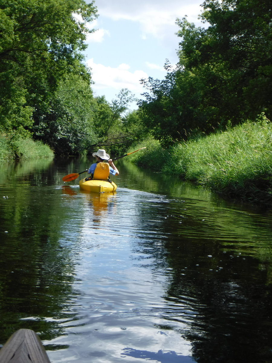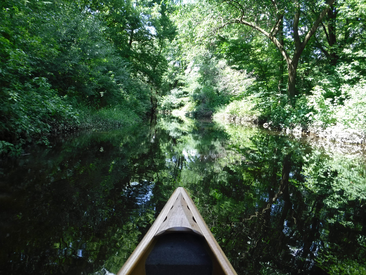 With temperatures in the upper 70’s and a big rain a few days ago, conditions seemed  ideal for a paddle on Starkweather Creek. Our kayaking friend Gene joined us on this beautiful sunny Sunday afternoon. We were a little concerned about the high water and the low bridges, but it was reassuring that a couple of friends were able to paddle a canoe under the low bridges 2 days before.  A lot of big boats were launching at Olbrich, and we were very glad to have them turn left and take their speed and noise to Lake Monona, while we turned right and headed upstream on peaceful Starkweather Creek.