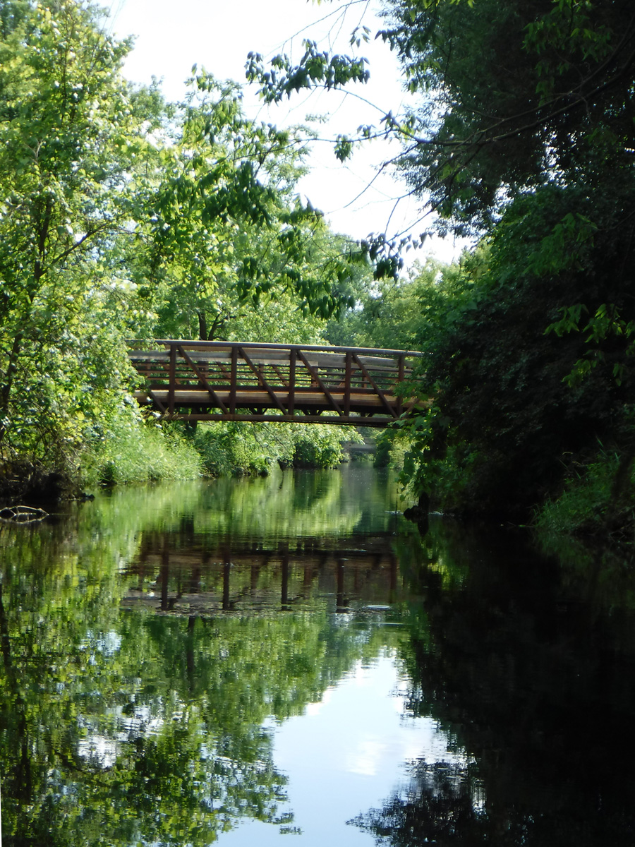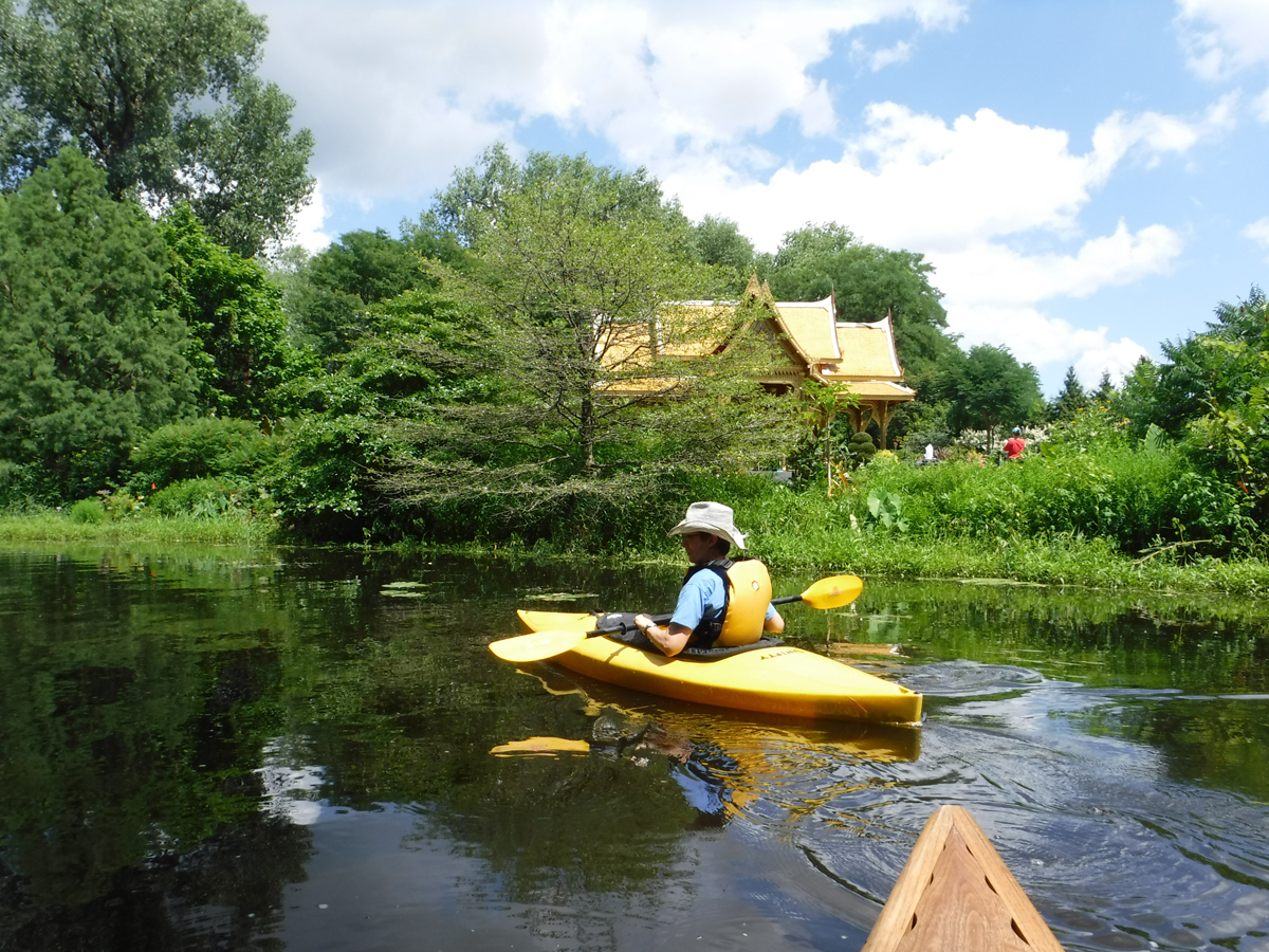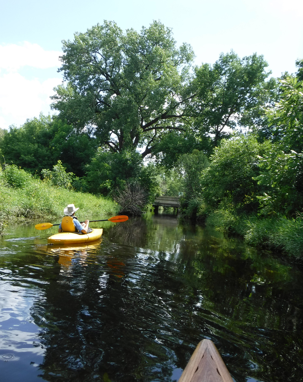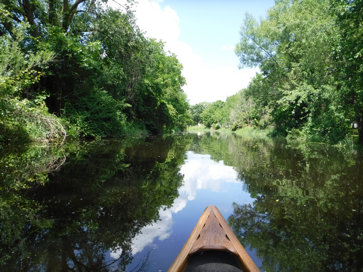 With temperatures in the upper 70’s and a big rain a few days ago, conditions seemed  ideal for a paddle on Starkweather Creek. Our kayaking friend Gene joined us on this beautiful sunny Sunday afternoon. We were a little concerned about the high water and the low bridges, but it was reassuring that a couple of friends were able to paddle a canoe under the low bridges 2 days before.  A lot of big boats were launching at Olbrich, and we were very glad to have them turn left and take their speed and noise to Lake Monona, while we turned right and headed upstream on peaceful Starkweather Creek.
