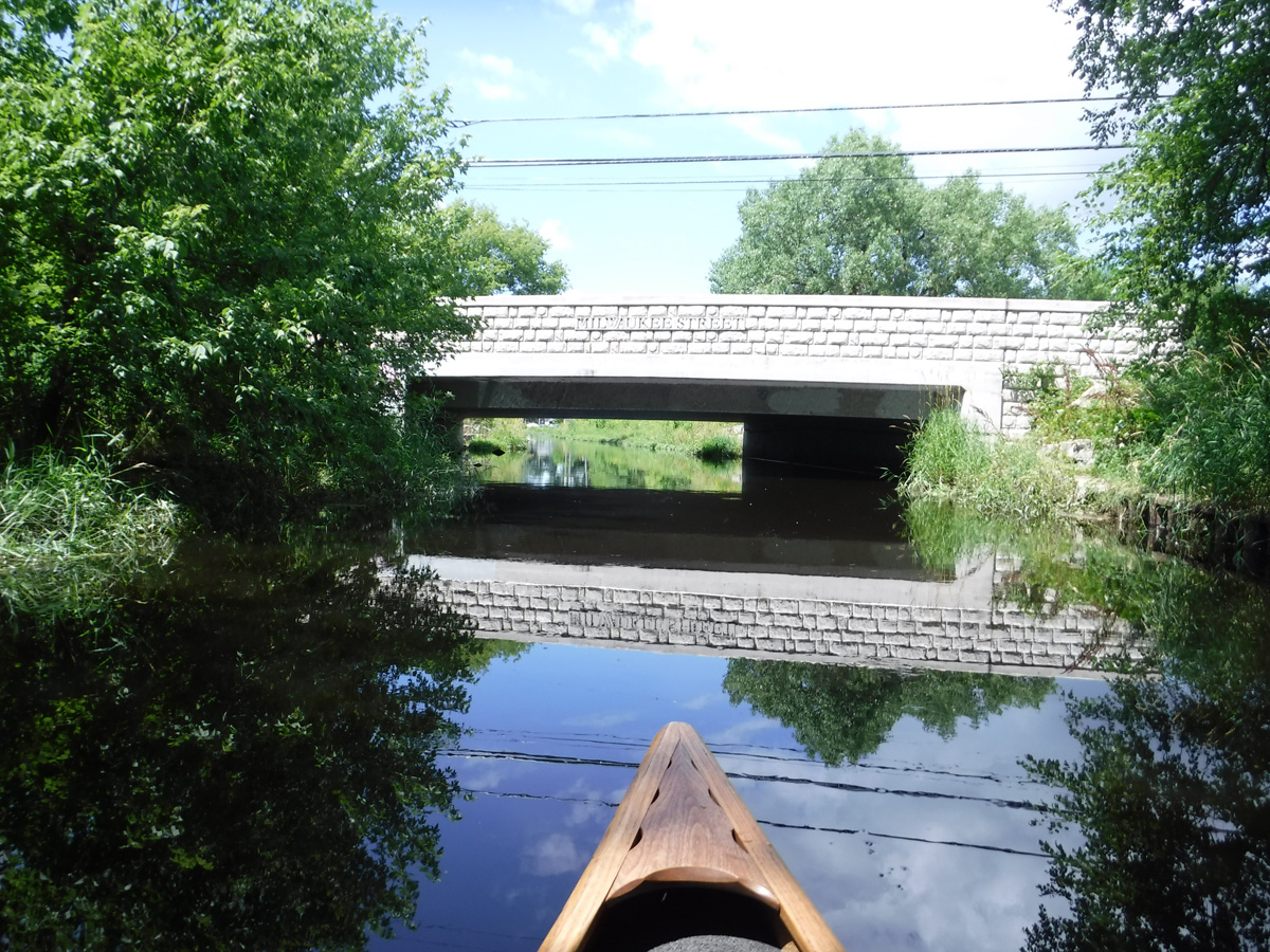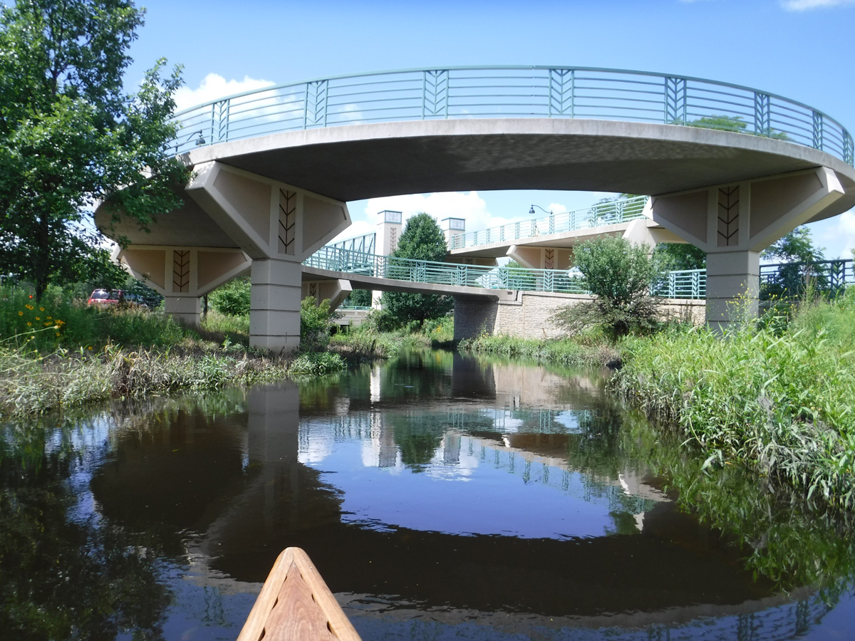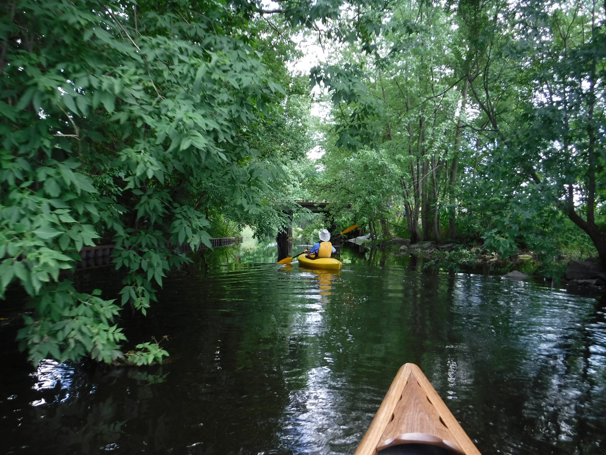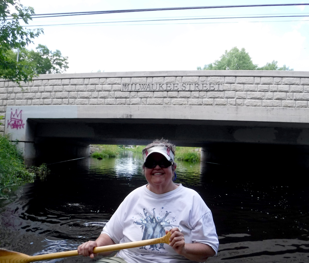 The high water level required some serious ducking to get under the railroad bridge by Olbrich and the low bridge over Milwaukee St. Clearance was adequate for the other bridges and tunnels. We knew the water was higher than we’ve ever paddled it by how much we had to fold ourselves over to get under the two lowest bridges.  We thought the creek would be lousy with paddlers, but except for a few other kayakers and a couple of stand-up paddleboarders, we had the creek to ourselves.