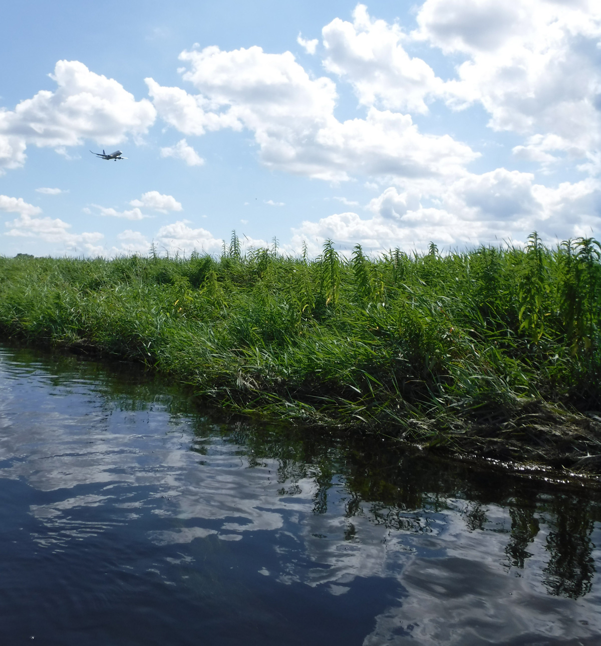 Once we got away from the launch area, the surroundings were serene. The rippling vegetation under the water was hypnotic. The reflections were outstanding. Nature and the Friends of Starkweather Creek ensured that the water and creek banks were quite clean. No duckweed or algae scum this time and just one beer can sighted. Of course neither Nature nor the Friends can do much about the invisible PFA’s. There were no deadfall obstructions, and we paddled all the way to Anderson St. by MATC and the airport. A plane flew over us on its landing path just as we turned around to head back downstream.