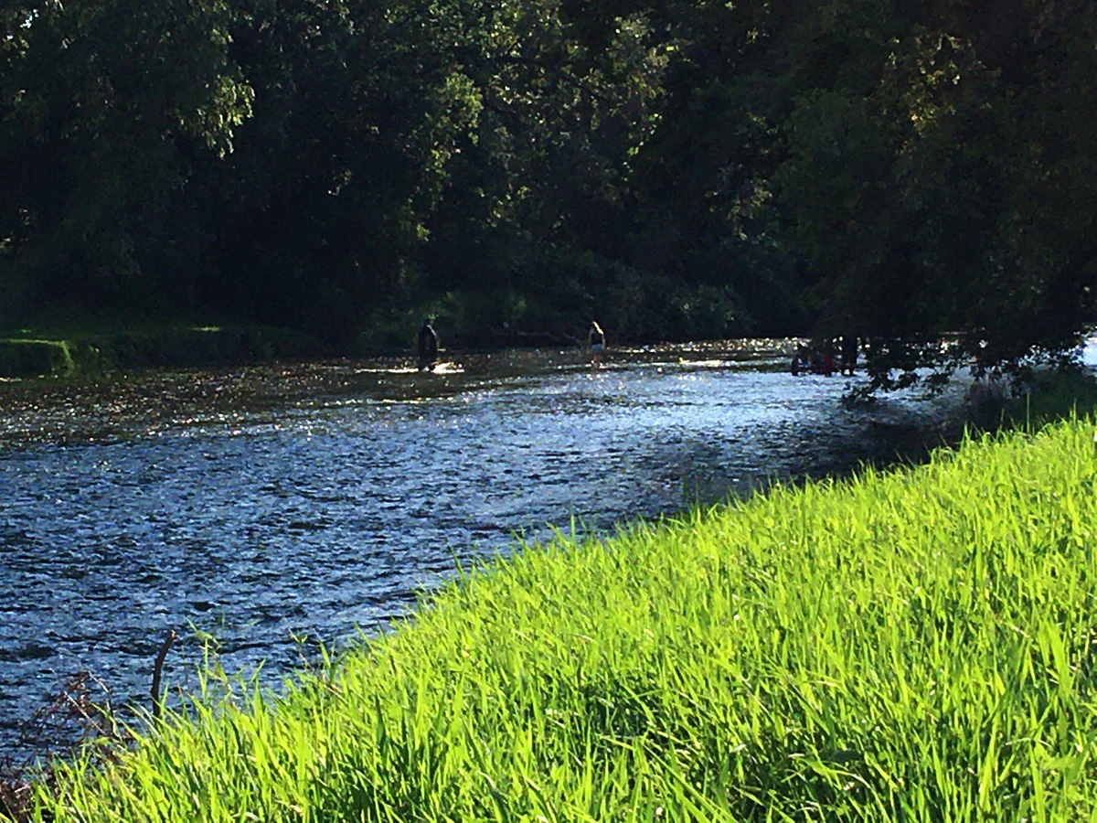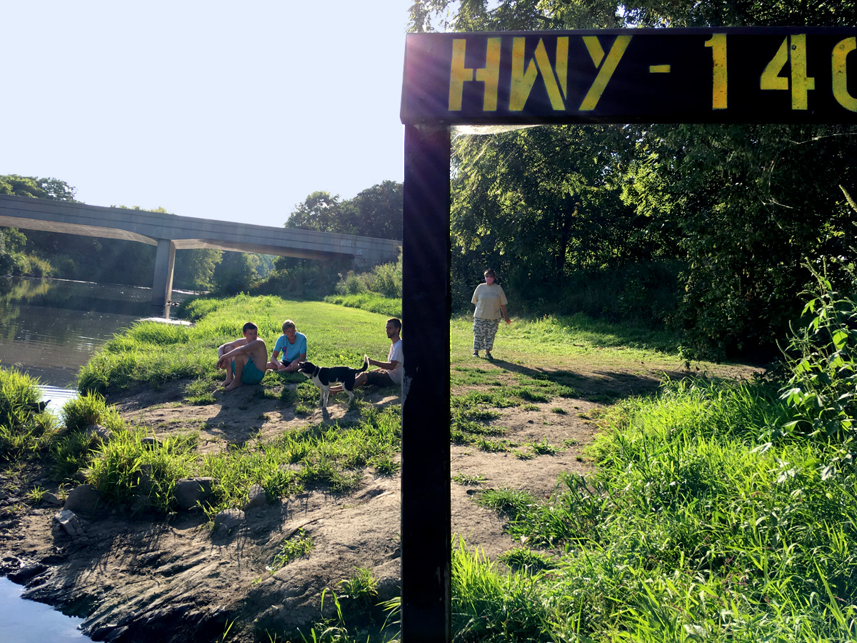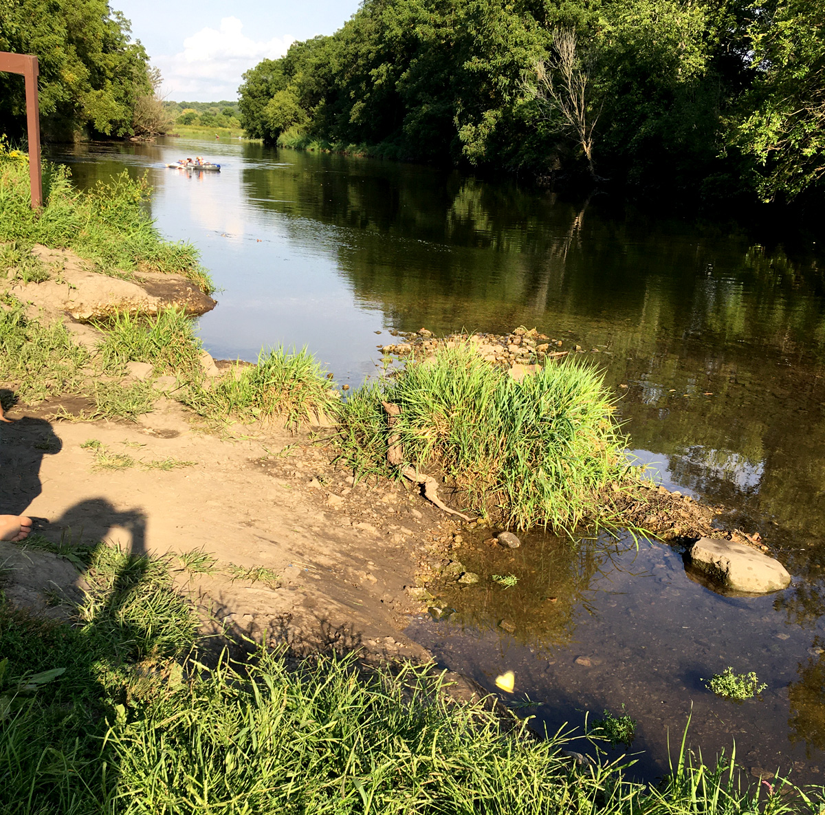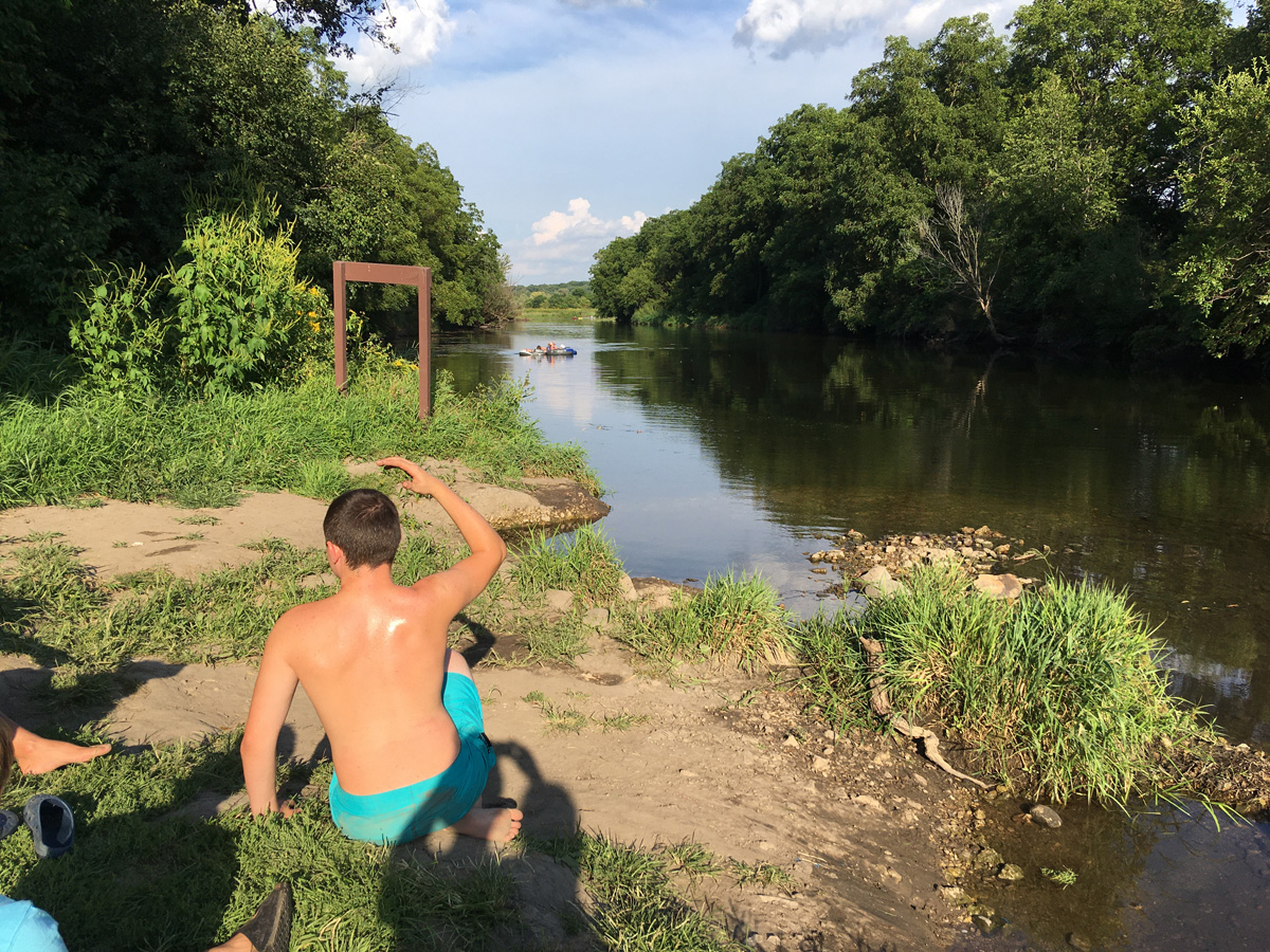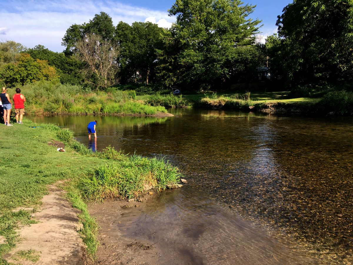 On to Sweet Allyn Park, Beloit, WI which was busy on this muggy afternoon with paddlers, tubers, waders, picnickers, and fishermen. Restrooms with pit toilets were open. The landing area is large, shallow and gravelly; and one might have to get out in the creek and pull or carry the canoe up onto the shore. This wouldn’t be too much of a problem. From 140 bridge this is about 3 hours.