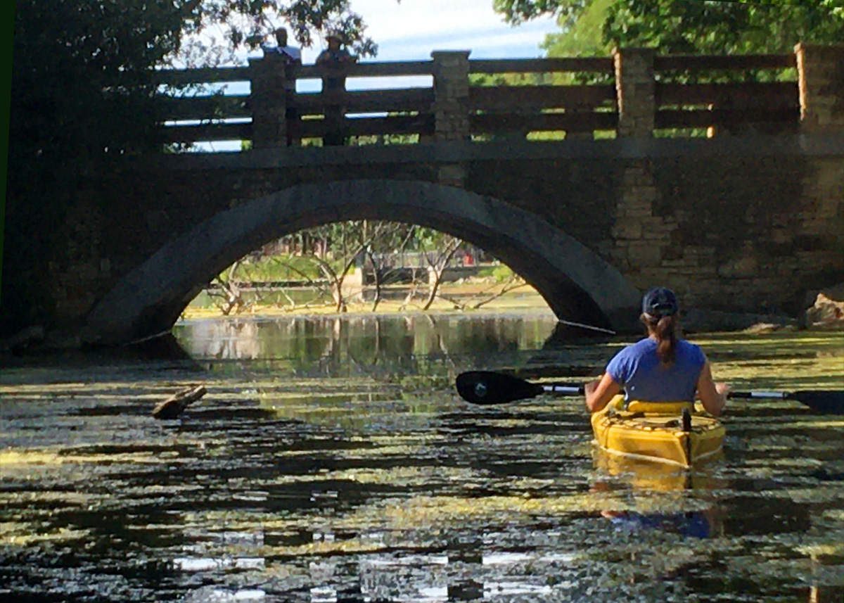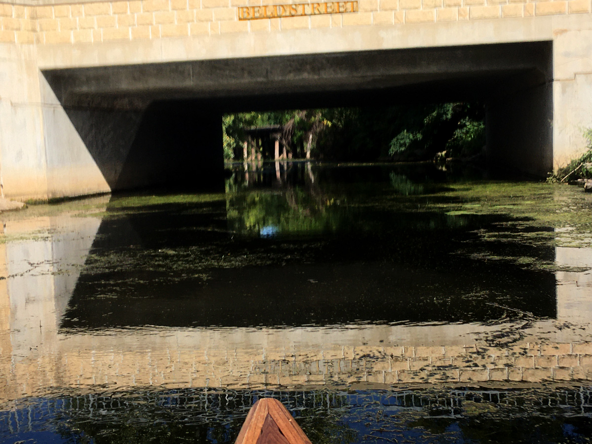 Water level:  There is no gauge on Wingra Creek. When we want to paddle there, we simply drive over and eyeball it for flow and muck factor. Set your GPS to: 599 W Wingra Drive, Madison. Park, walk across the pedestrian bridge, go right for about a block to check out the area under the first arched stone bridge. If there is going to be trouble (low water, high water, blockage), it’s going to be there.