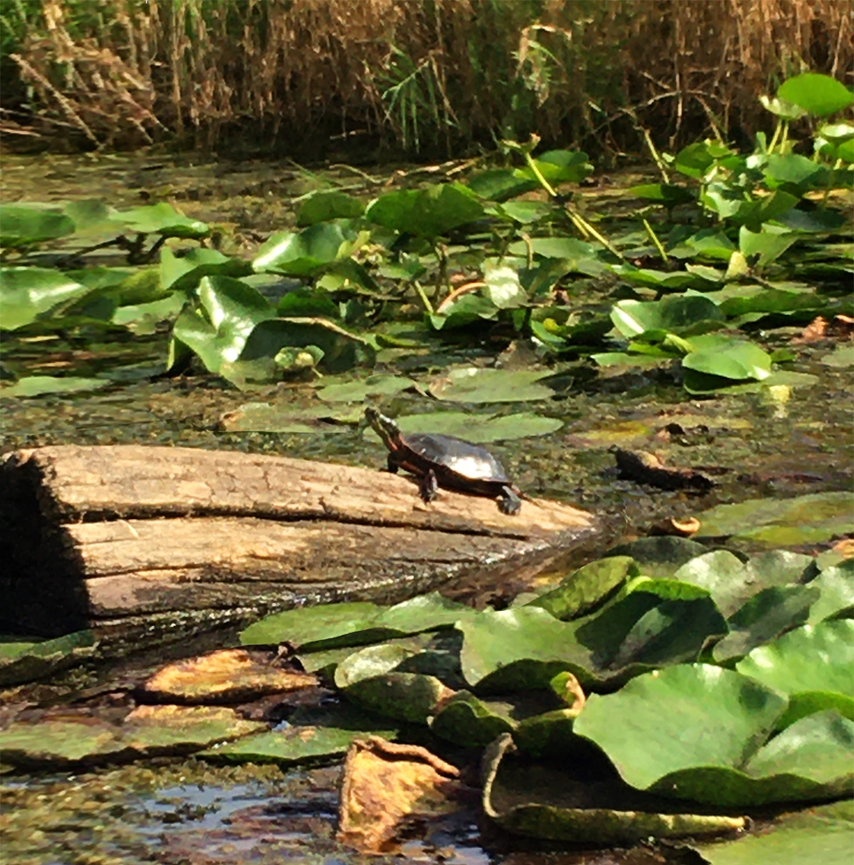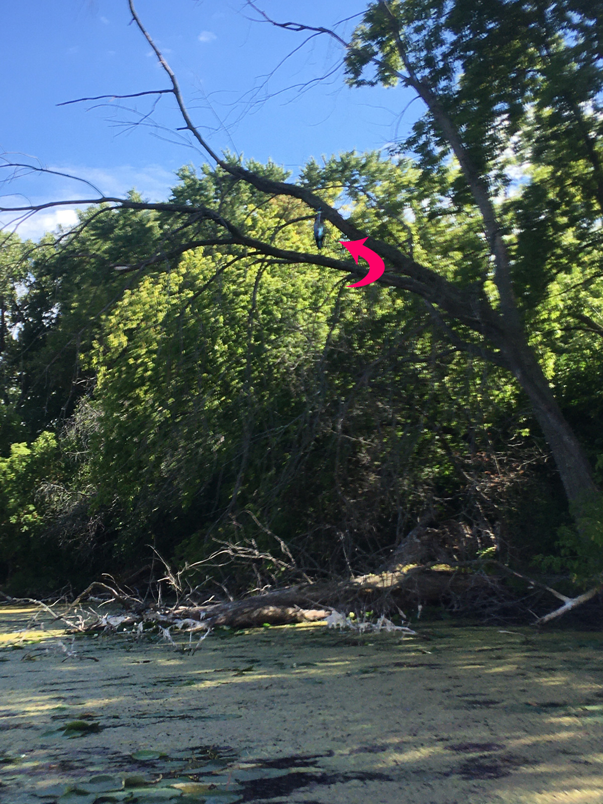 We saw gazillion small fish, one big catfish or carp, a pair of noisy kingfishers, sparrows, cardinal, dragonflies, mallard ducks which didn’t seem at all bothered by paddlers, painted turtles, green heron and a stately great blue heron perched on a branch near the Wingra Dam. Unlike most heron we encounter on our paddles, this one was very tolerant of our presence and posed nicely for photos.