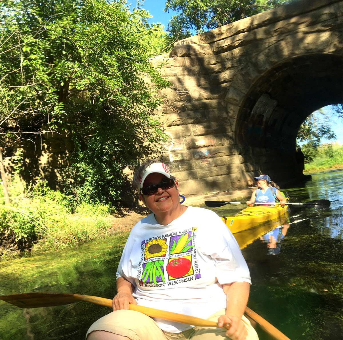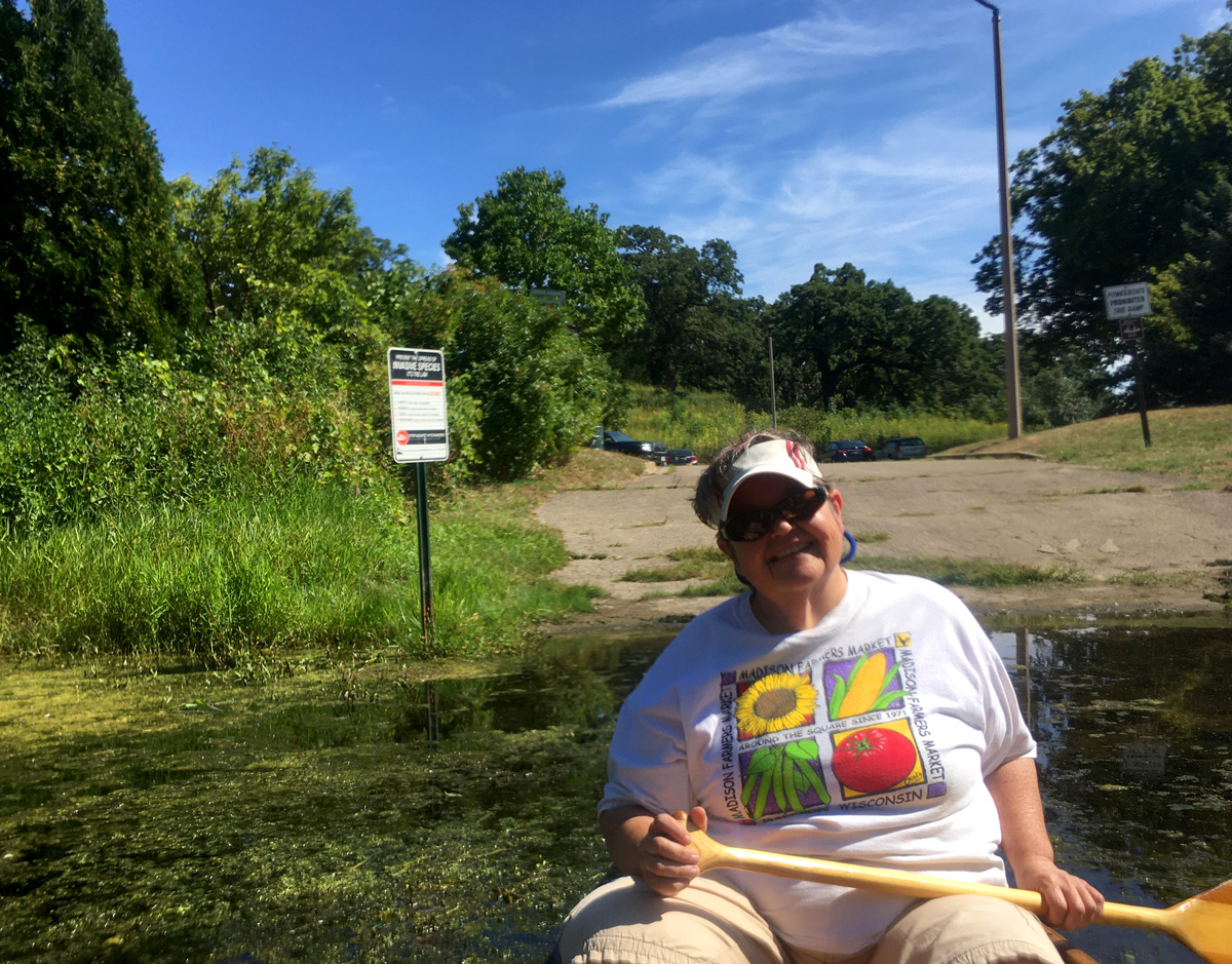 The two of us in our canoe and Katia in her kayak paddled from Olin Park to Lake Wingra on a temperate Sunday afternoon, a nice respite from many days of oppressive heat. Lots of people had the same idea. Despite the lack of rain in the past several weeks, water levels were adequate although current was quite sluggish, favorable conditions for duckweed and algae to accumulate. However, it was good to be on the water and introduce our friend to this easy urban paddle.