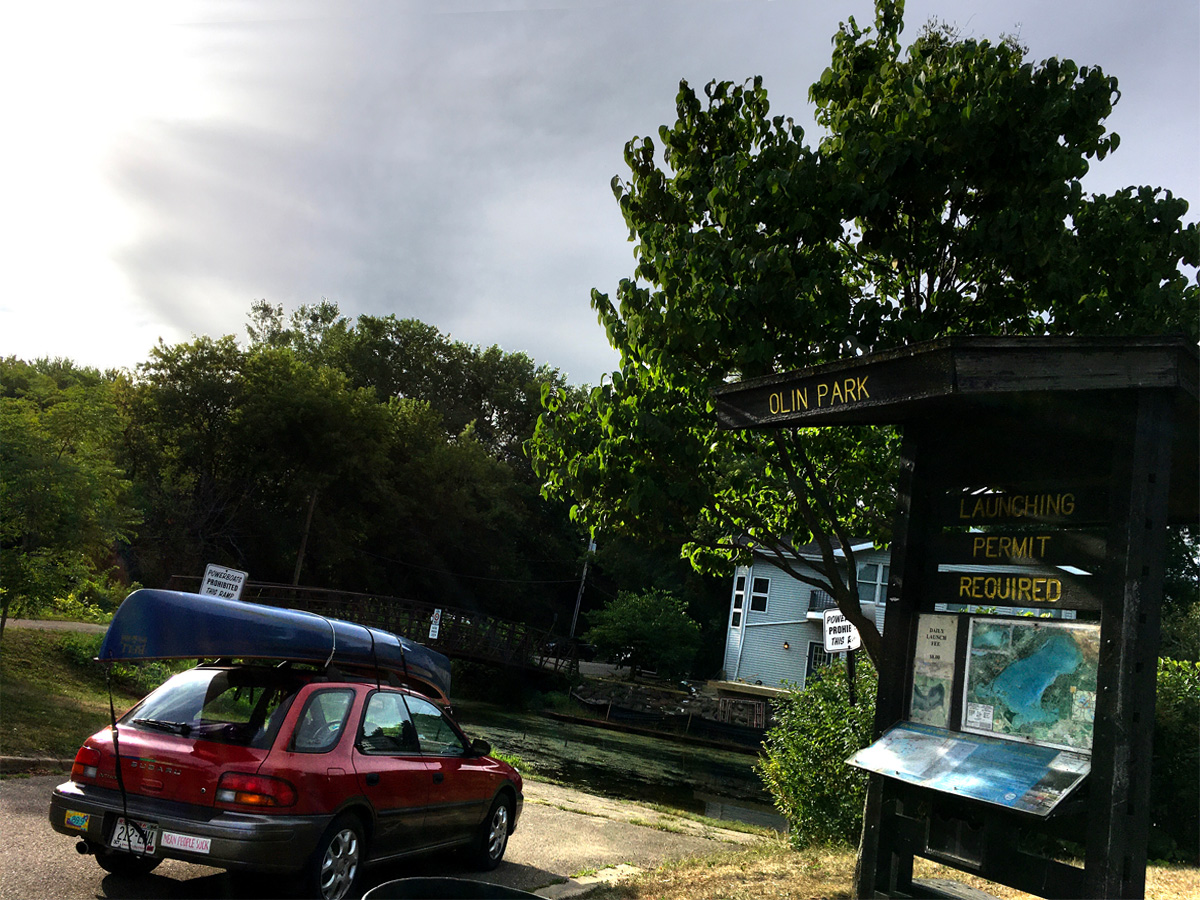 Olin-Turville Park has a nice dedicated concrete ramp for canoes and kayaks that is separate from the motor boat launch. A launch fee is not charged for boats that don’t require trailers. Most of the parking is reserved for vehicles with trailers, and there was only one open space in the whole parking lot, which we gave to Katia since she has a broken foot. I had to drive out of the parking lot, cross the bridge over the creek and parallel park along the side of the road. It would have taken no time at all if I had skipped the step of searching for an open spot in the lot.