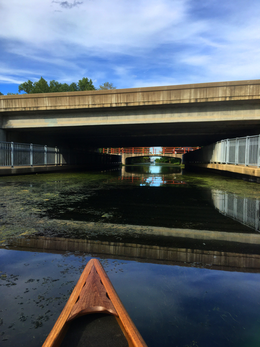 The turn around point for this route is a dam at the bottom of Lake Wingra. To go further you need to “go up a step”. There is an awakward place to portage – a sign says “get out” – but at that point we are ready to turn back around anyway.