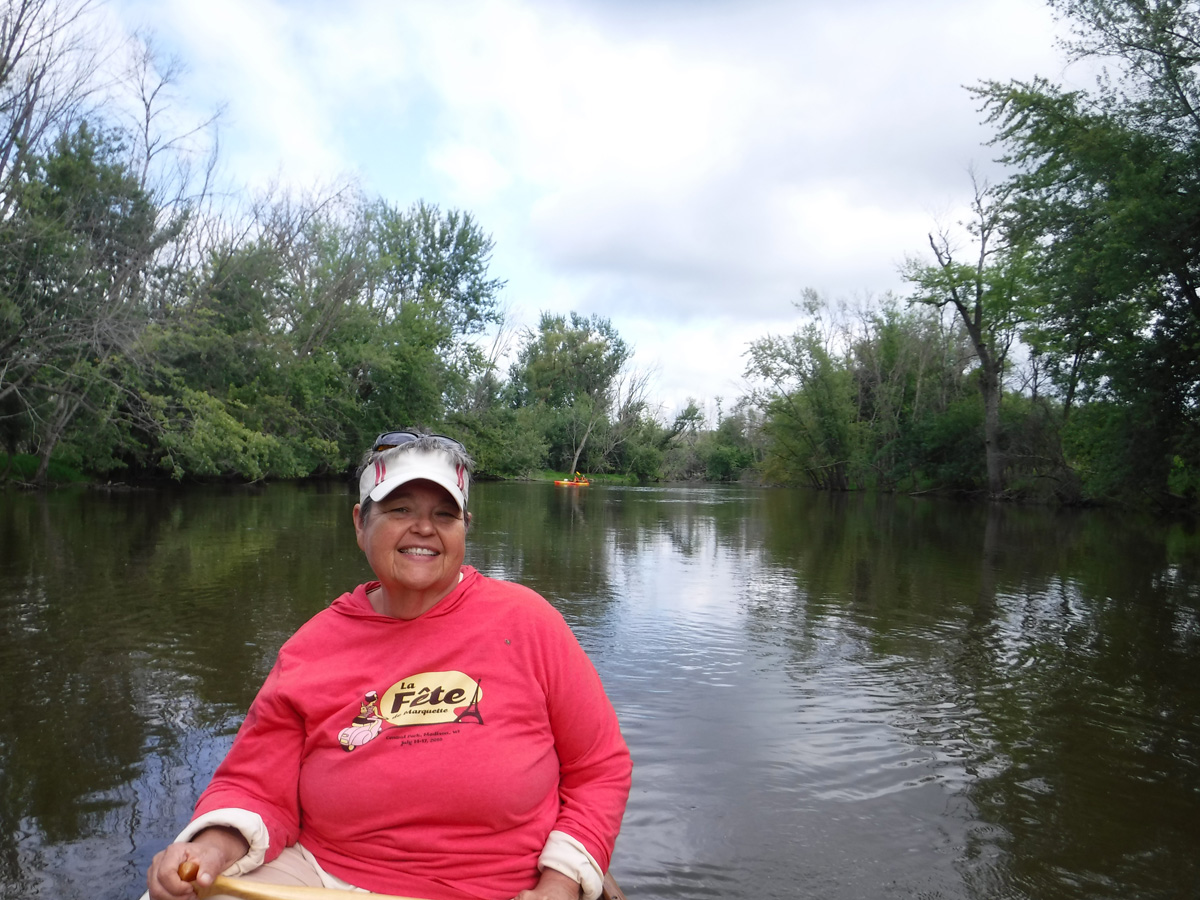 Susan happy paddling on a cloudy day (Rock River)