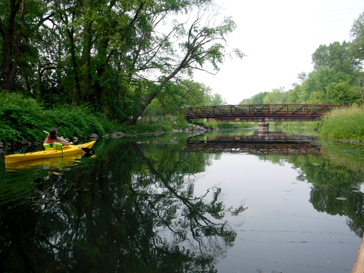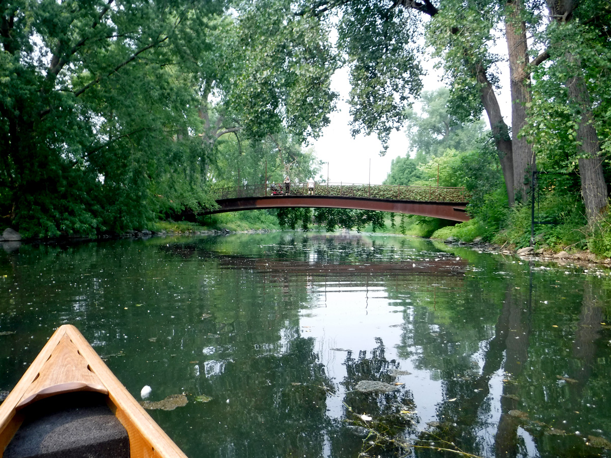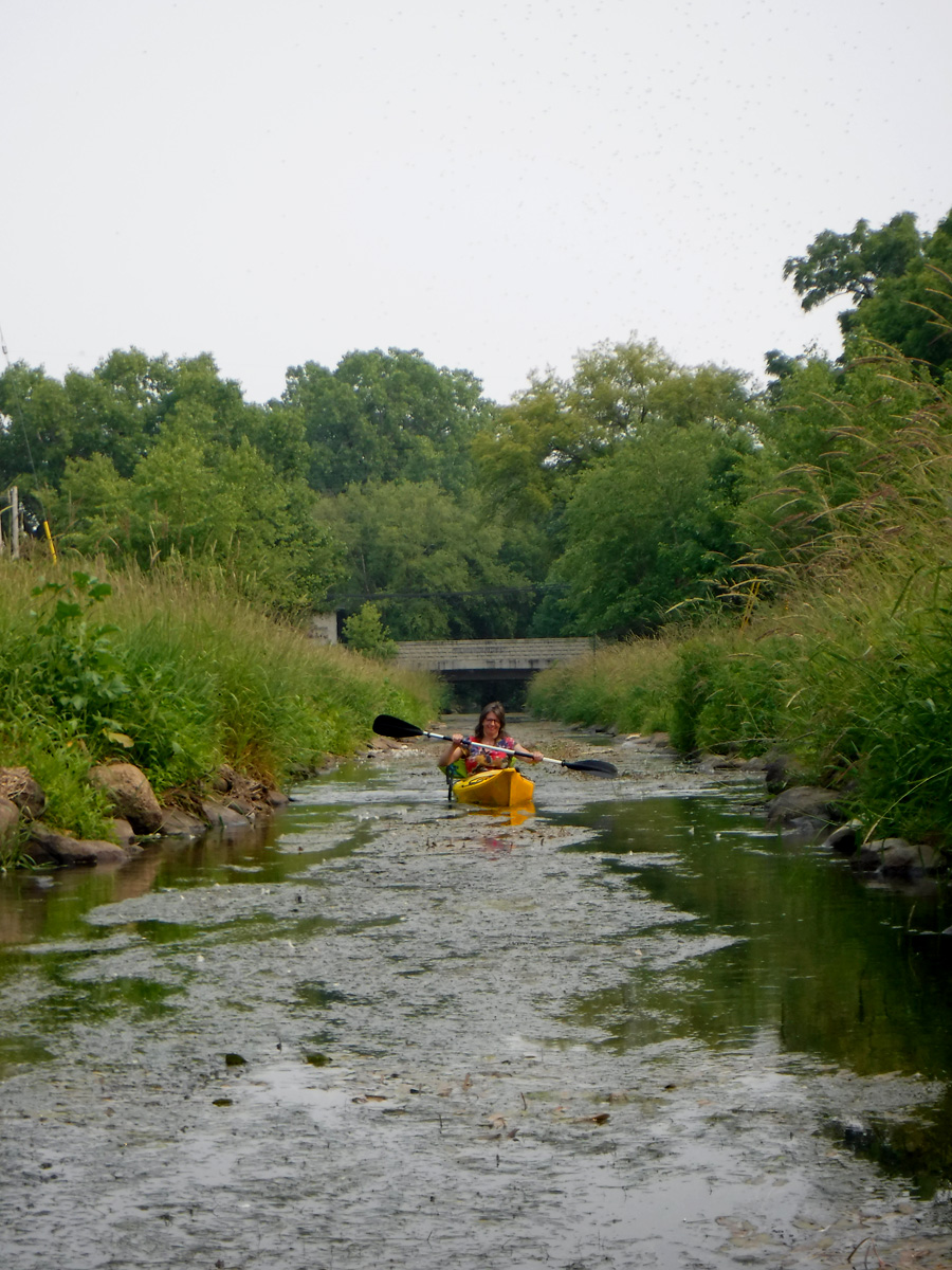 The put-in at Olbrich Gardens boat launch looked promising as did several places that we spied over the last day or two – the water was clear and inviting. When we got to the decision point of left / right creek channel we saw that it was not going to be the perfect day. First we paddled to the left. We got as far as the Milwaukee Street bridge but it eventually got weedy and then even weedier. It was especially hard for kayak paddling. In addition to weeds and a bit of algae, there were gnats galore. So back down the stream to the right branch of the creek – we didn’t get very far to see that the channel that goes past Voight Farm was awful as well.