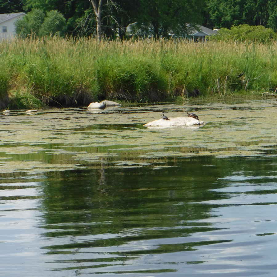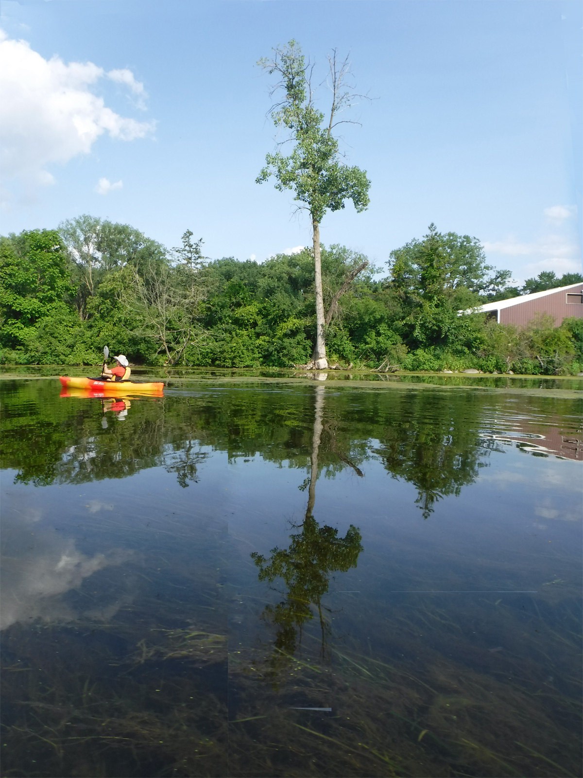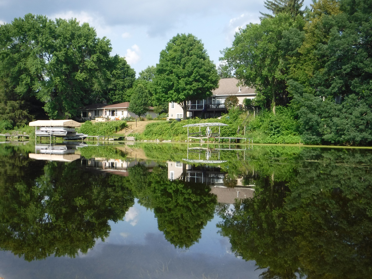 It was fun to see so many dragonflies around. The water was very quiet and reflective even thought here was a bit of a breeze. It was pretty uneventful except at the end of the paddle when a teenaged (we guess?) boy came toward us on a jet-ski. No problem at that point, but the river was full of weeds and we discussed that it was a really stupid inexperienced idea to get off the big lake and come into the weedy river. Fifteen minutes later he came up behind us going quite fast – we told him to cut it out, the river is 100% no wake and clearly marked. He said the weeds were getting caught in his motor (duh) so he “couldn’t help it” and pretty much went full throttle once out of earshot of our complaints.