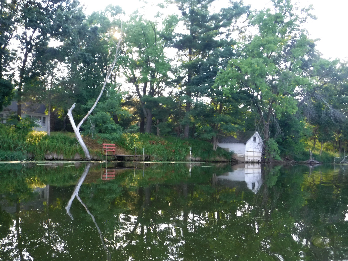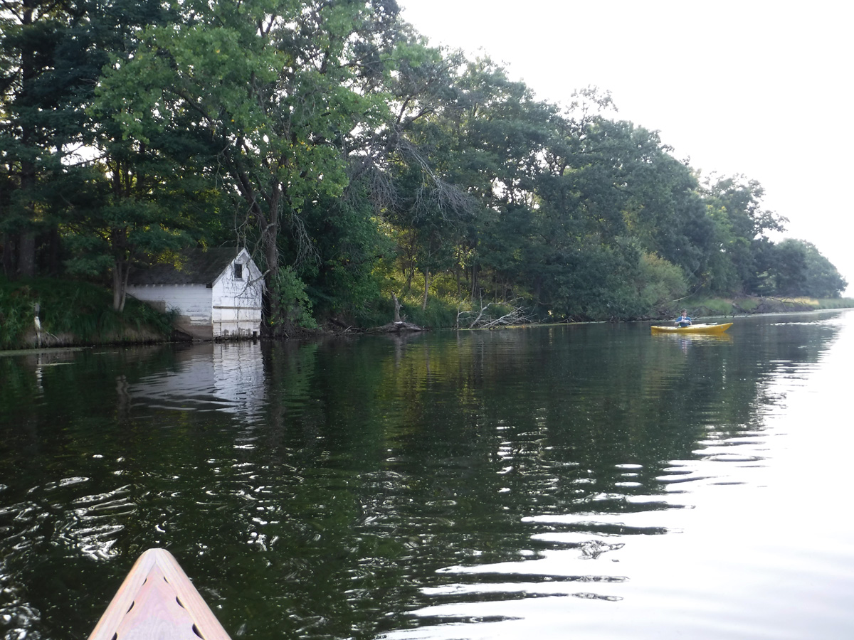 We finally got to where the shore was tree-lined and regretted that it was time to turn around. There was a beautiful reflection of a white tree which, in spite of our strict time constraint, we paddled toward. A nice surprise – the tree was by an old boathouse. It is still there! In the past we have seen it through water so high that half the door was submerged. Seeing the “point of interest” made it easier for us to turn around as we had made it to a remembered landmark.