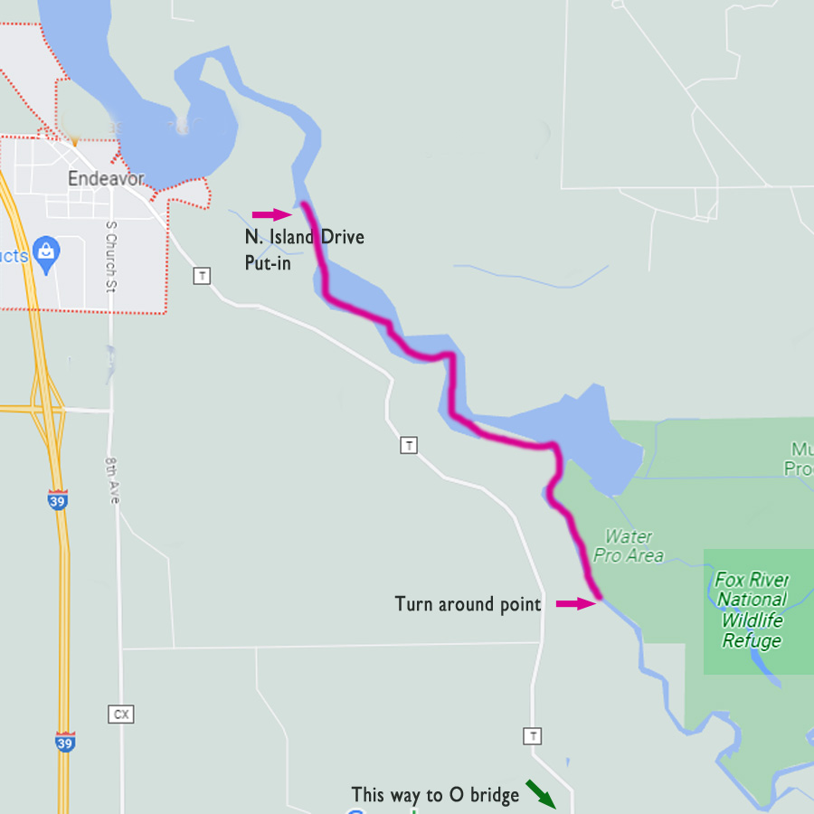 Last time we paddled the Fox River from the Endeavor boat landing was 2017. Happy to see that the boat access still exists six years later. We paddled south (upstream) and back – no shuttle.