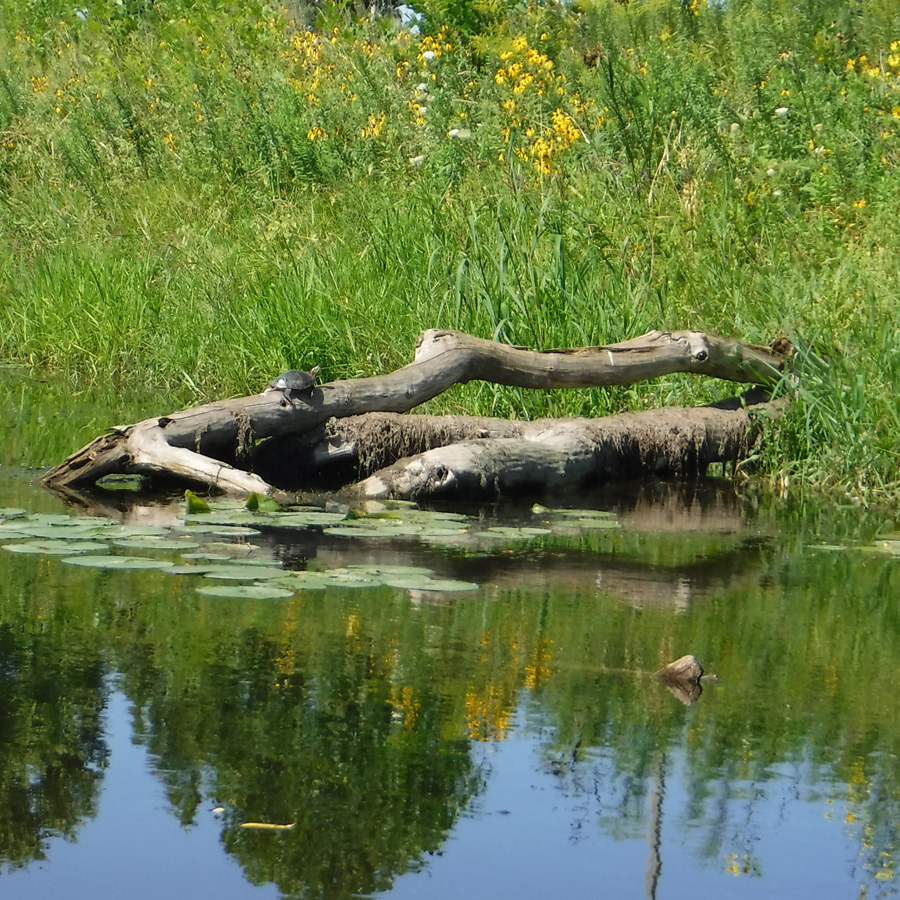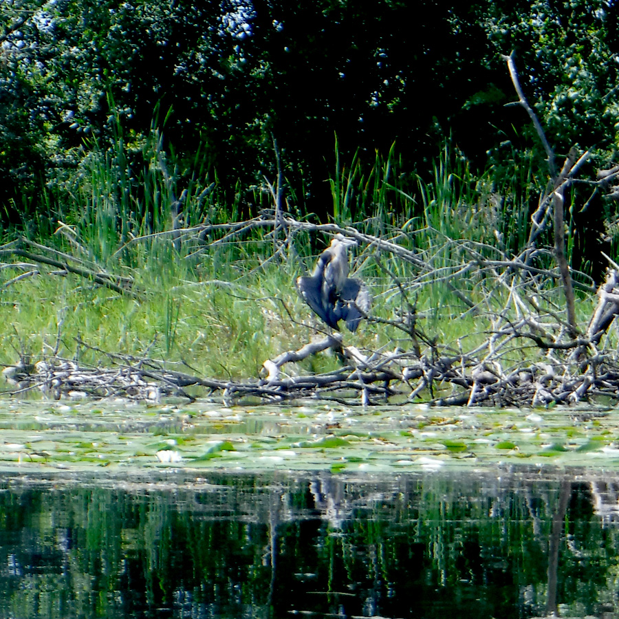Wildlife: ducks, turtles, freshwater clams, great blue heron, green heron (or possibly bittern), fish and other local birds.