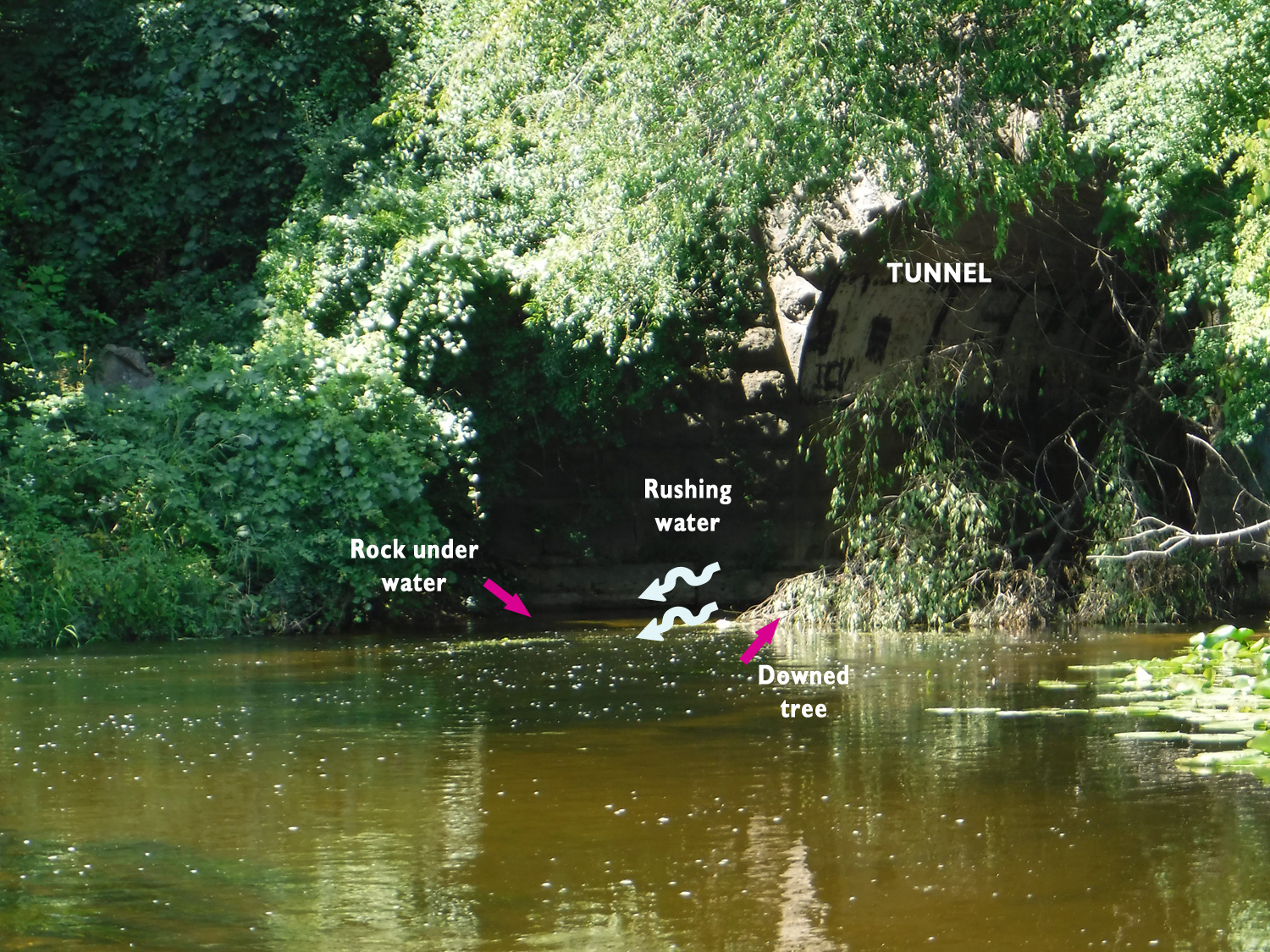 Step #2: In the tunnel. Unfortunately, Mary forgot to change into her sandals before launching, so she was wearing tennis shoes. As she started walking the boat through, we noticed there was also a rock just under the surface of the water at the south side of the tunnel opposite of the downed tree. The big surprise in the tunnel was a chest deep hole! Luckily it was just a step or two and she climbed back up pretty quickly and got to the other side of the tunnel.