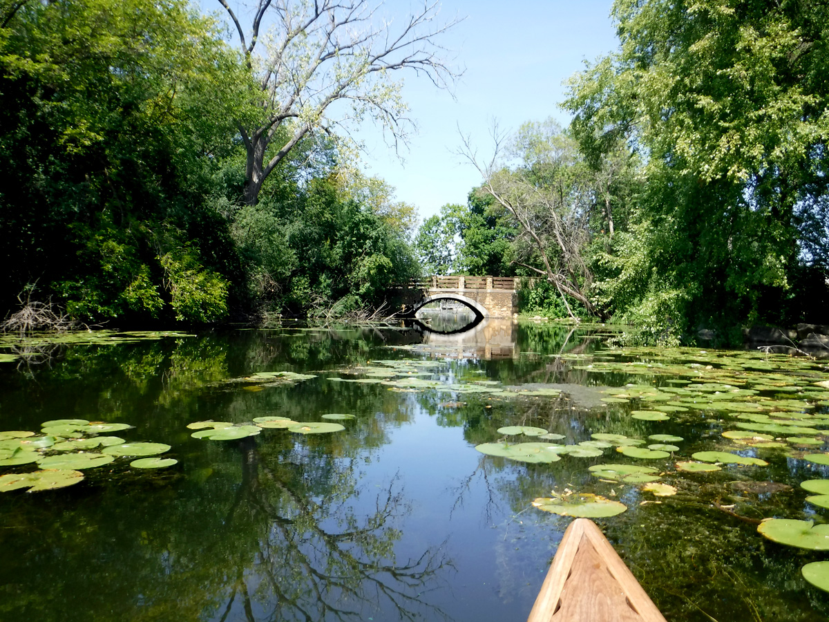 We turned around at the dam at the arboretum that marks the edge of Lake Wingra. As we approached our nemesis bridge, we hugged hugged hugged the north bank – we were really in the grasses. We paused to assess the situation and realized that the way we were lined up we could just maybe get through the tunnel without getting into the strainer on the left and without clipping the rock on the right. Resigned to the possibility we might go swimming we aimed the boat into the current, Mary hung onto the rope, and we zipped through – upright and much relieved. We should, one of these days, put our names and phone number on the canoe.